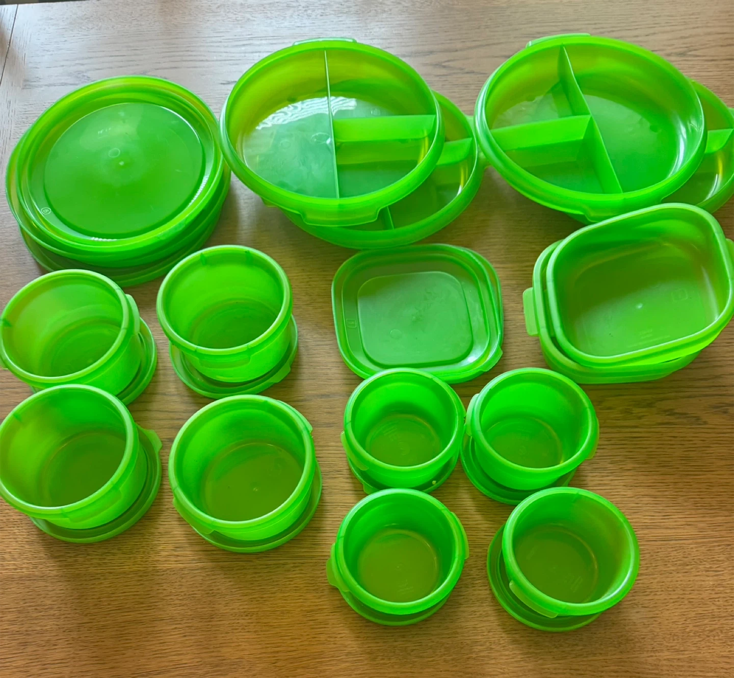 14 items w lids This set includes multiple round and square plastic food storage containers in a bright green color. They're ideal for organizing your pantry or packing lunches. Made of durable plastic.