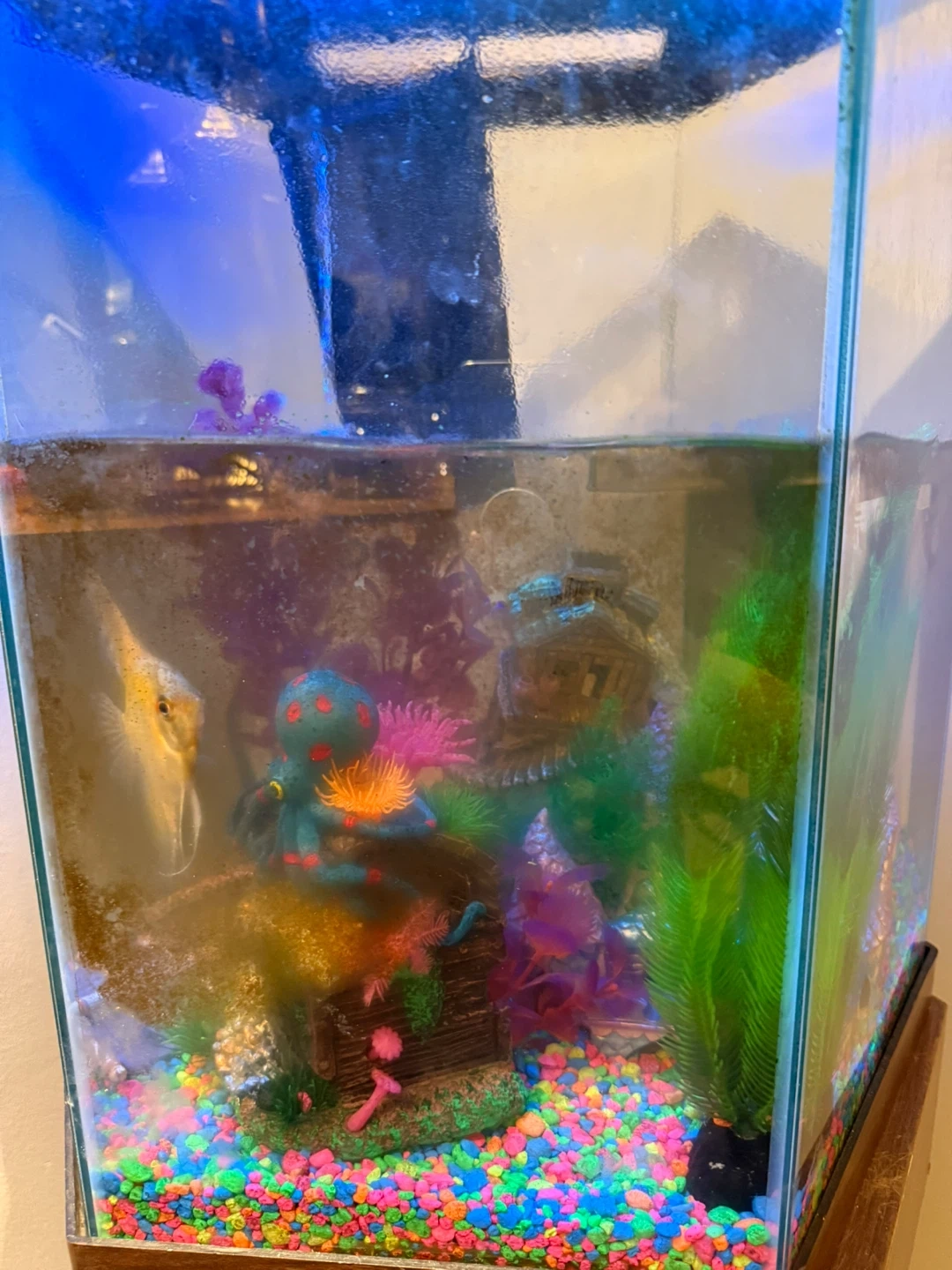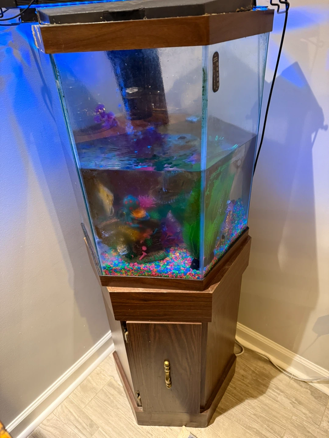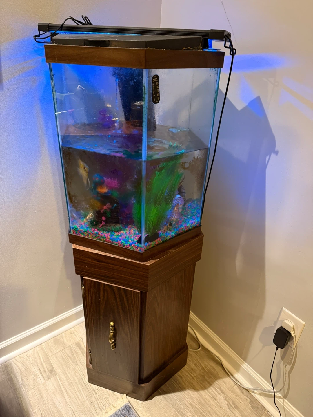 Selling a corner fish tank with a matching wooden cabinet! It's a unique shape that fits nicely in a corner, saving space. The tank includes colorful gravel, decorations, and a filter system. Perfect for someone looking to start or upgrade their aquarium setup.