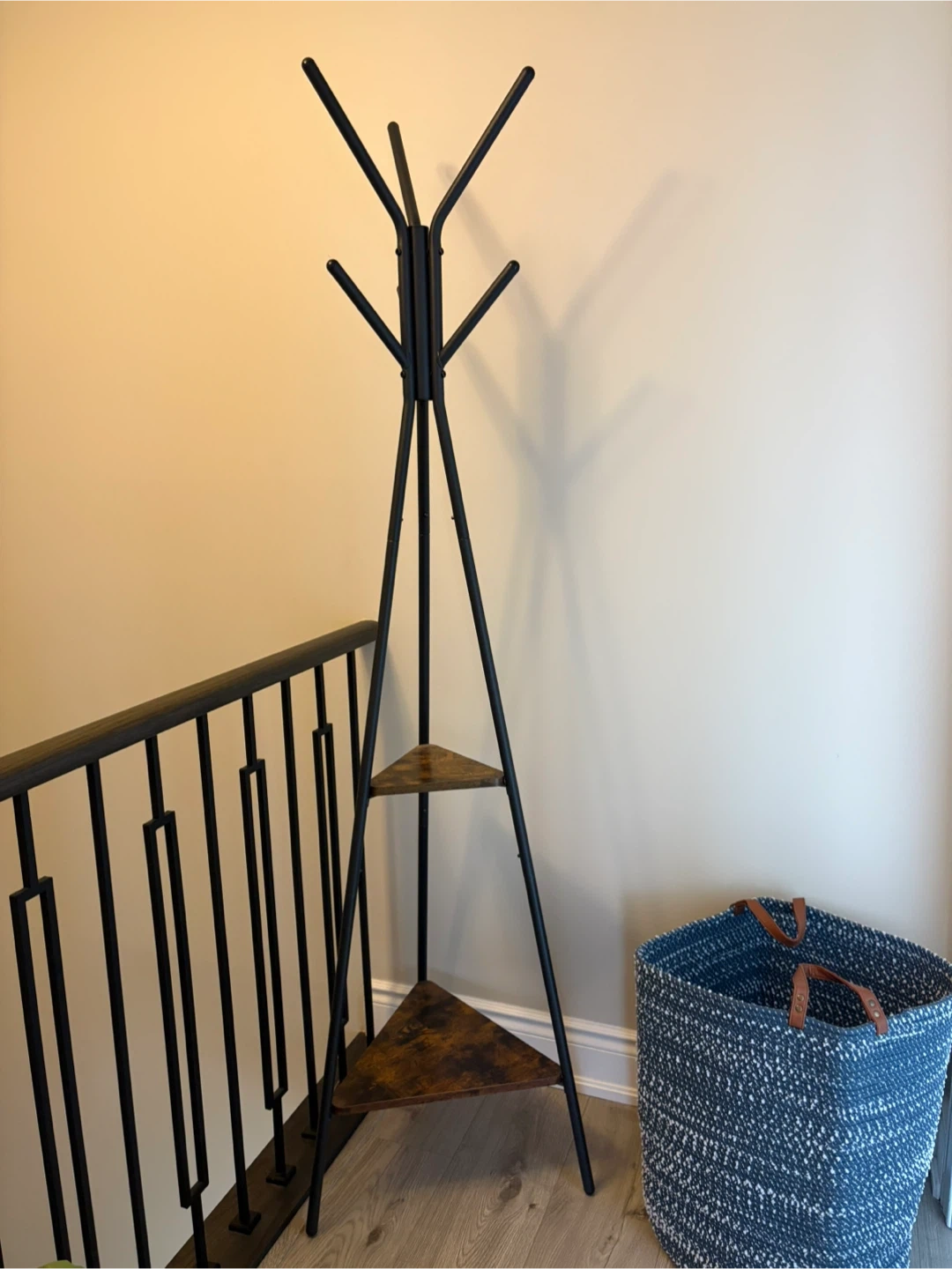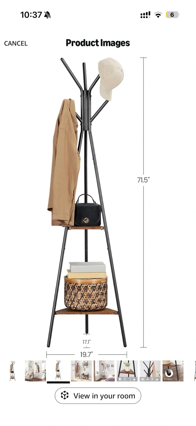 This standing coat rack features a metal frame with a rustic wood finish on its two triangular shelves. It stands 71.5 inches tall and has a base width of 19.7 inches. It's great for entryways or bedrooms to hang coats and hats, and the shelves offer extra storage.