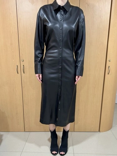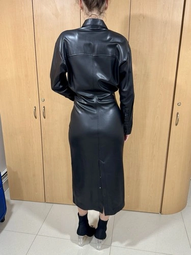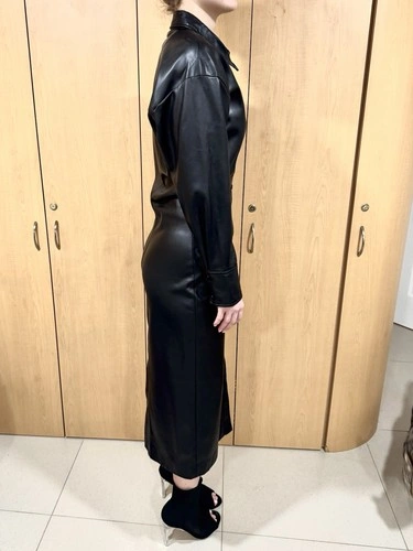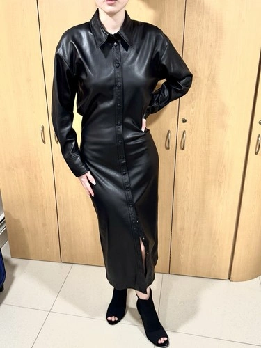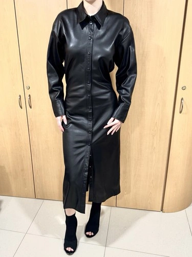 ZARA Black Faux Leather Button Front Shirt Dress Long Sleeve M