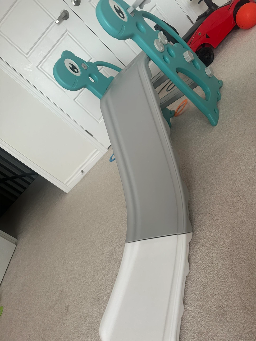 This teal and grey children's slide and climber set is perfect for little ones to enjoy indoor or outdoor fun. It's designed with safety in mind, featuring easy-to-climb steps and a gentle slide. The durable plastic construction ensures it can withstand hours of play. This item is suitable for toddlers and young children.