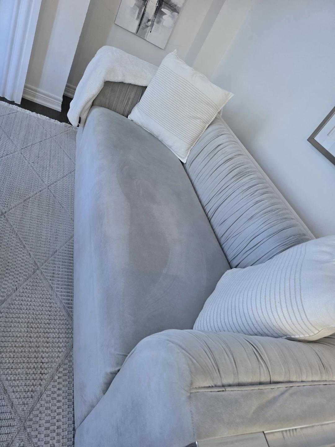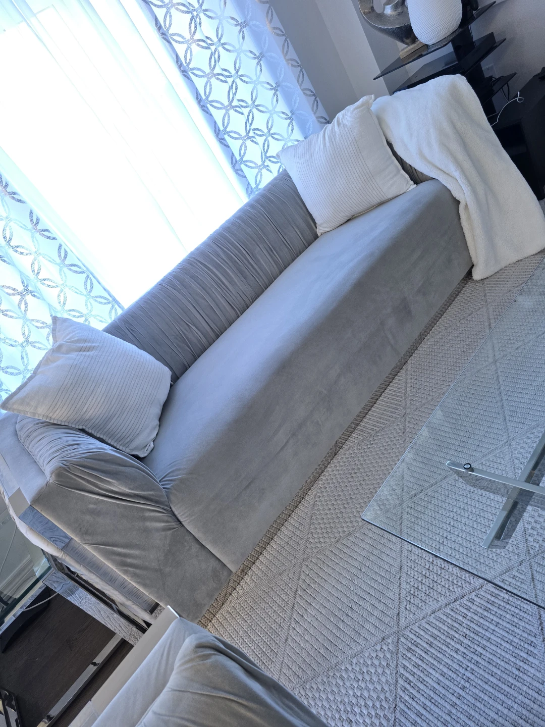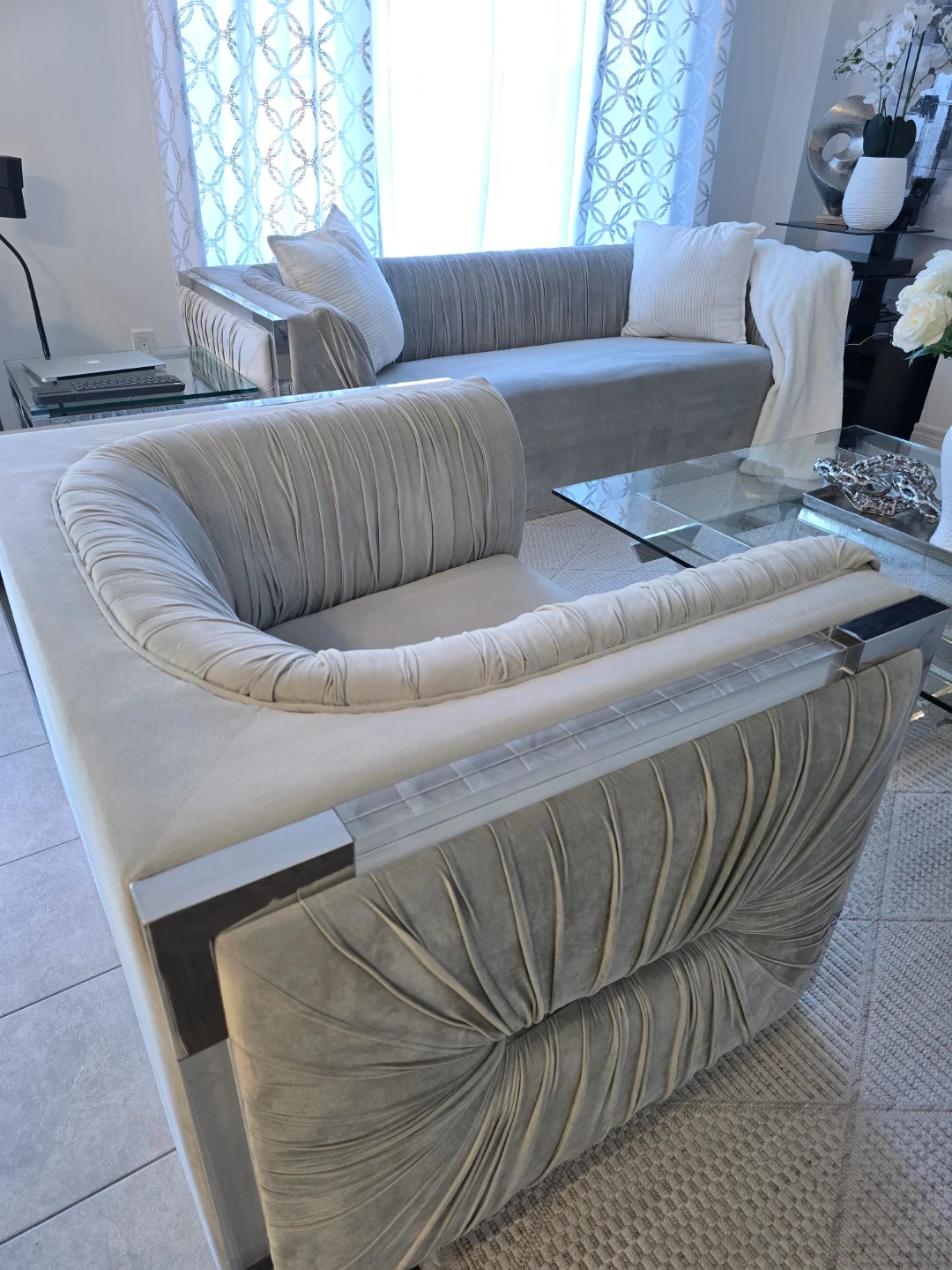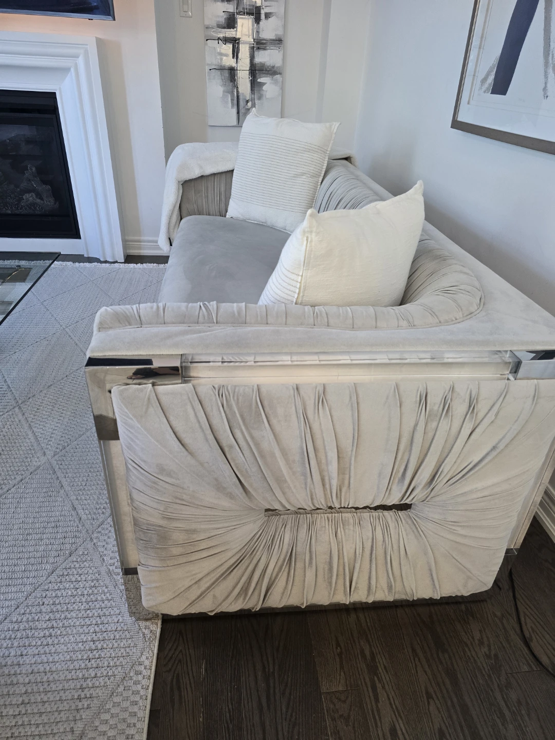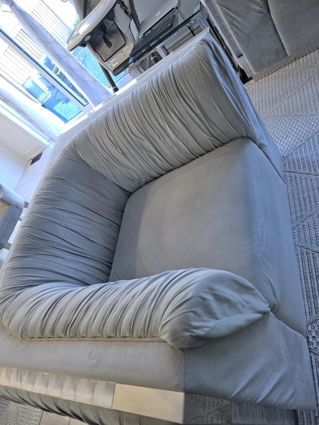 Stylish grey velvet sofa with a unique tufted design on the arms and back. Features a plush seating area. This sofa adds a touch of modern elegance to any living space.