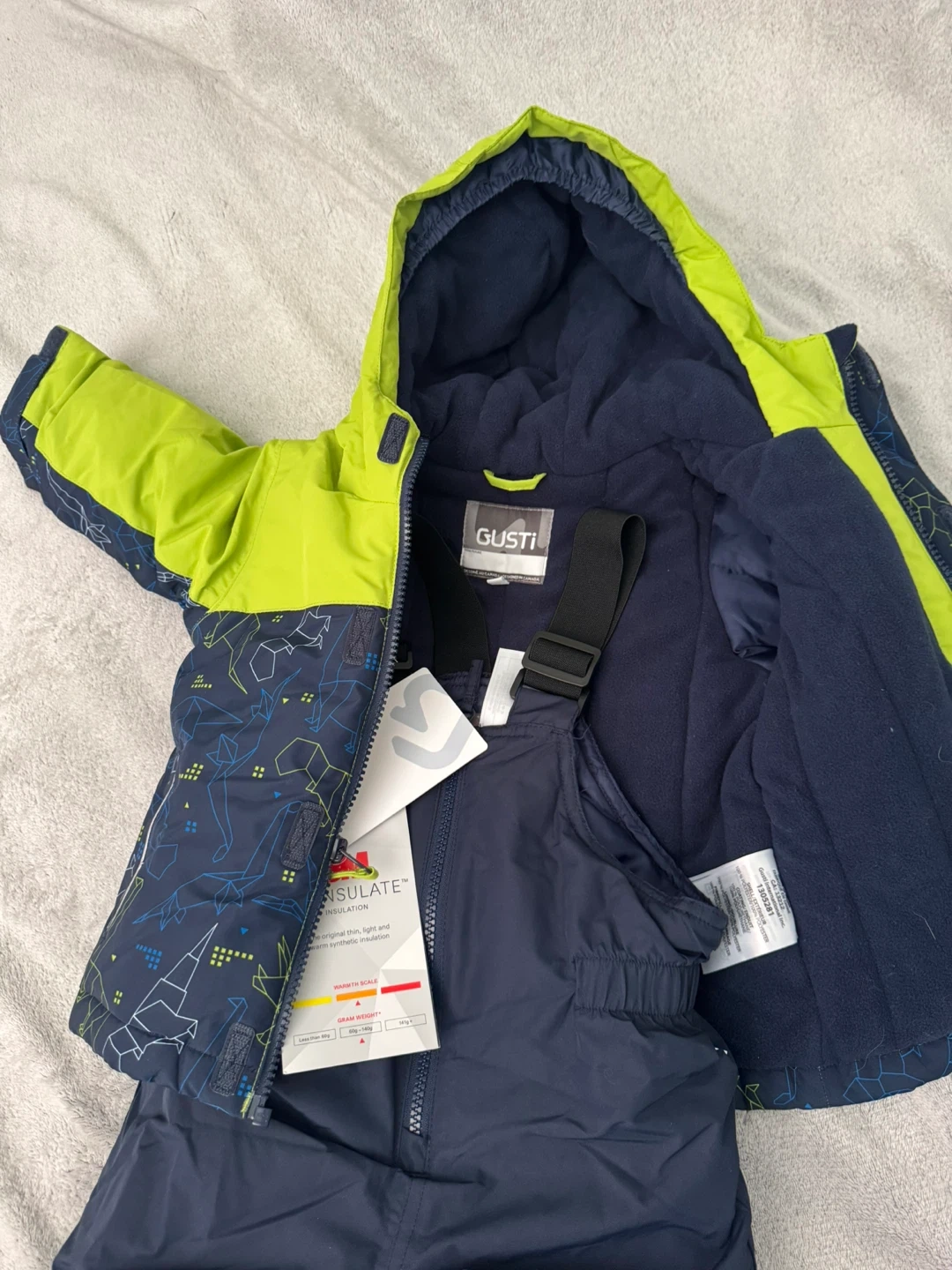 This is a brand new Gusti snowsuit, perfect for keeping your little one warm and dry during the winter months! It's a size 18M and features a vibrant green and navy blue colour scheme. The snowsuit is made with 3M Thinsulate insulation for maximum warmth and comfort. It's designed in Canada!