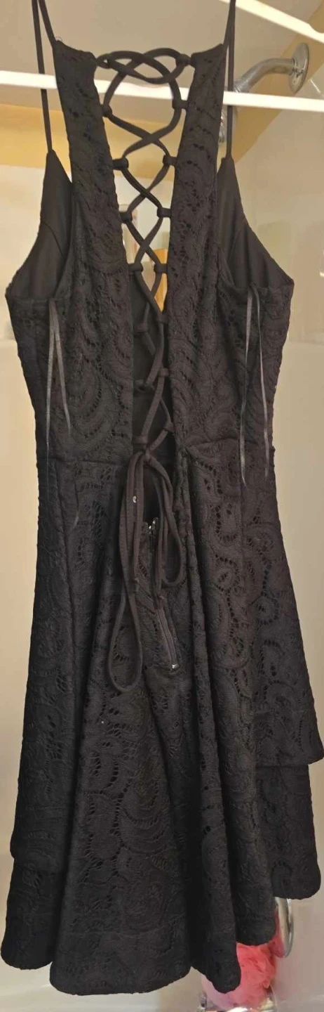 This black lace dress features a stylish criss-cross back with adjustable tie-up detailing. It's a flattering fit-and-flare style, perfect for a night out or a special occasion. The lace overlay adds a touch of elegance to the design.
