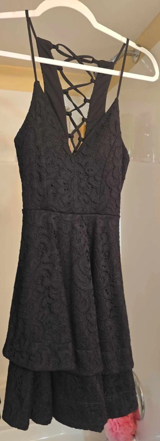 This black lace dress features a stylish criss-cross back with adjustable tie-up detailing. It's a flattering fit-and-flare style, perfect for a night out or a special occasion. The lace overlay adds a touch of elegance to the design.