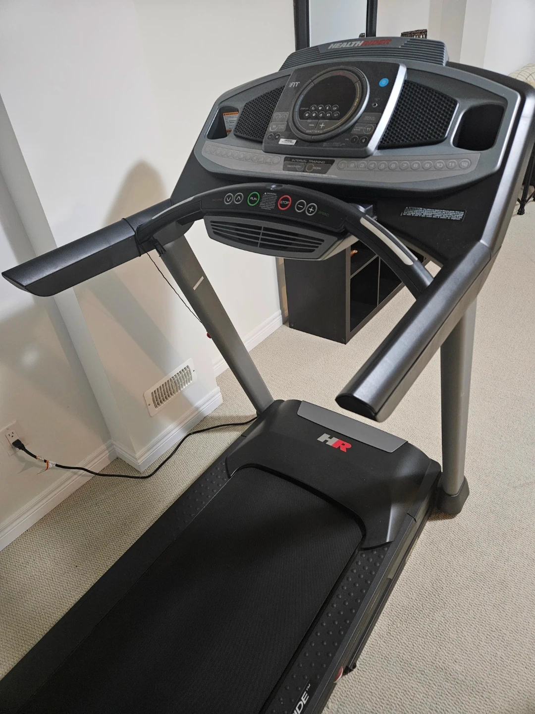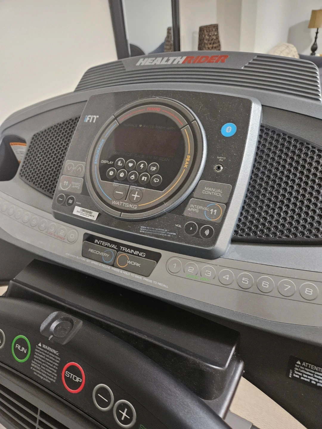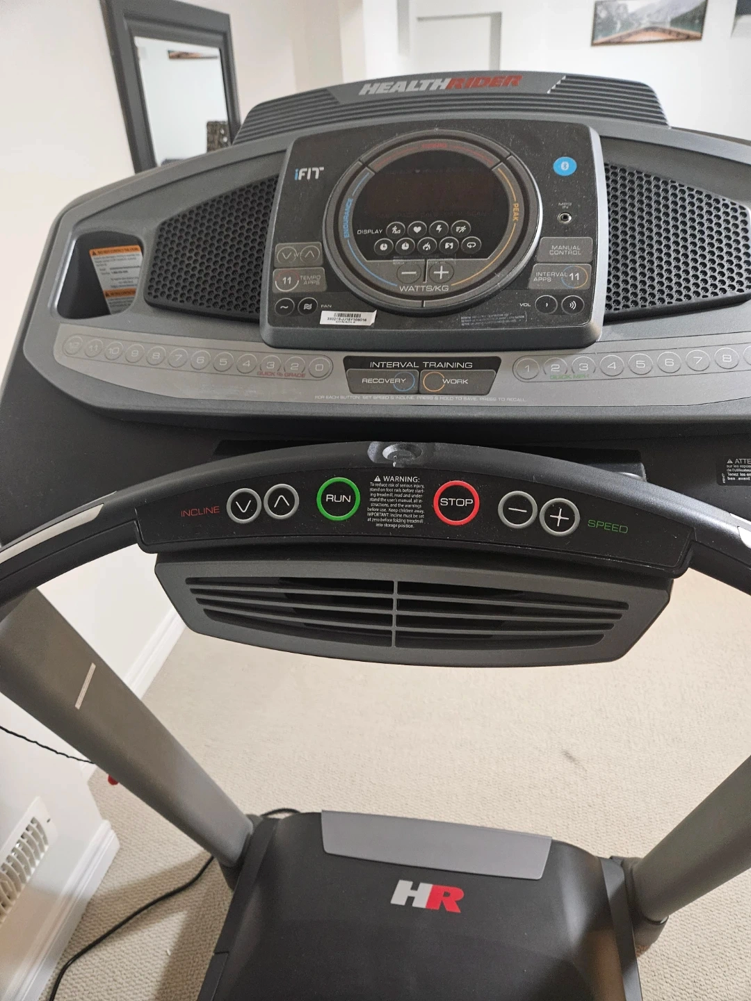 This is a HealthRider treadmill with iFit compatibility. It offers various training modes like interval training and recovery. The console displays time, pace, calories, and distance (KM/MPH).