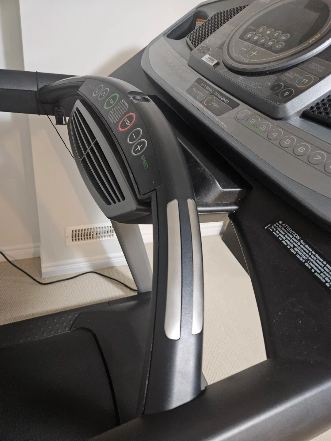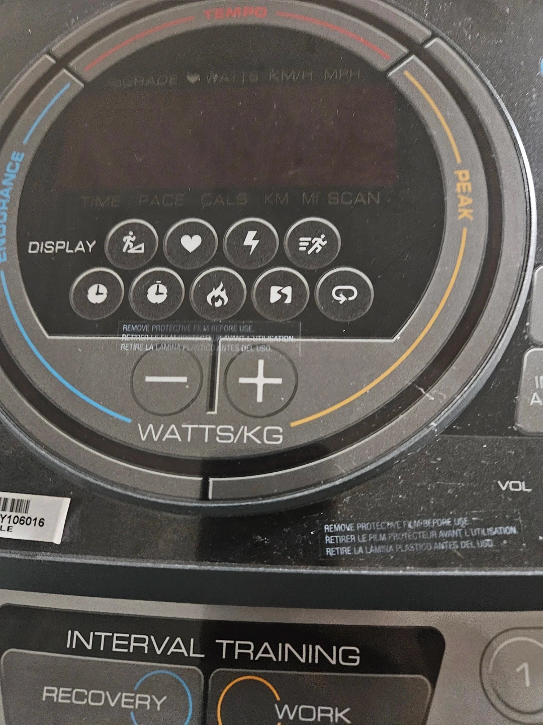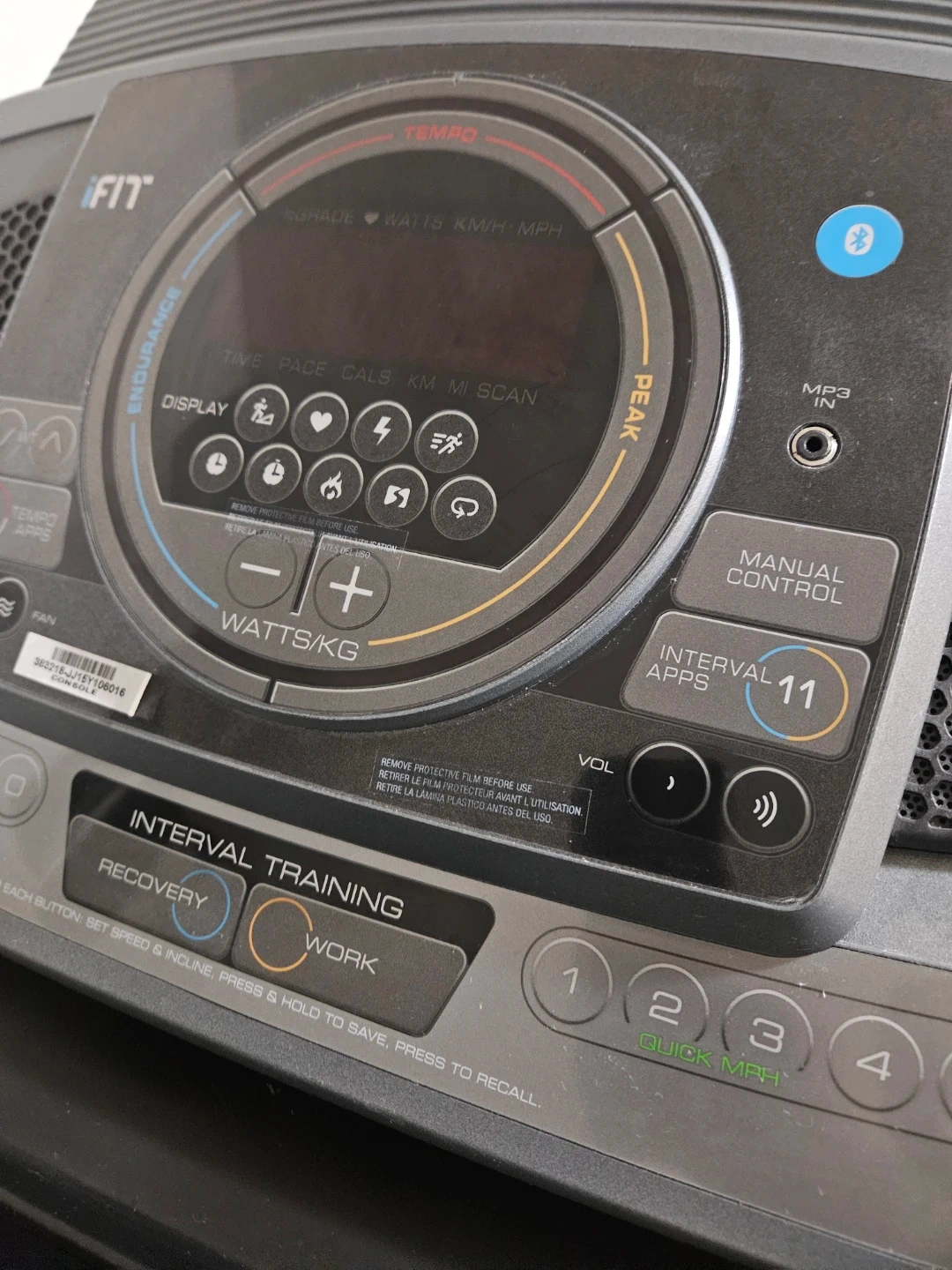 This is a HealthRider treadmill with iFit compatibility. It offers various training modes like interval training and recovery. The console displays time, pace, calories, and distance (KM/MPH).