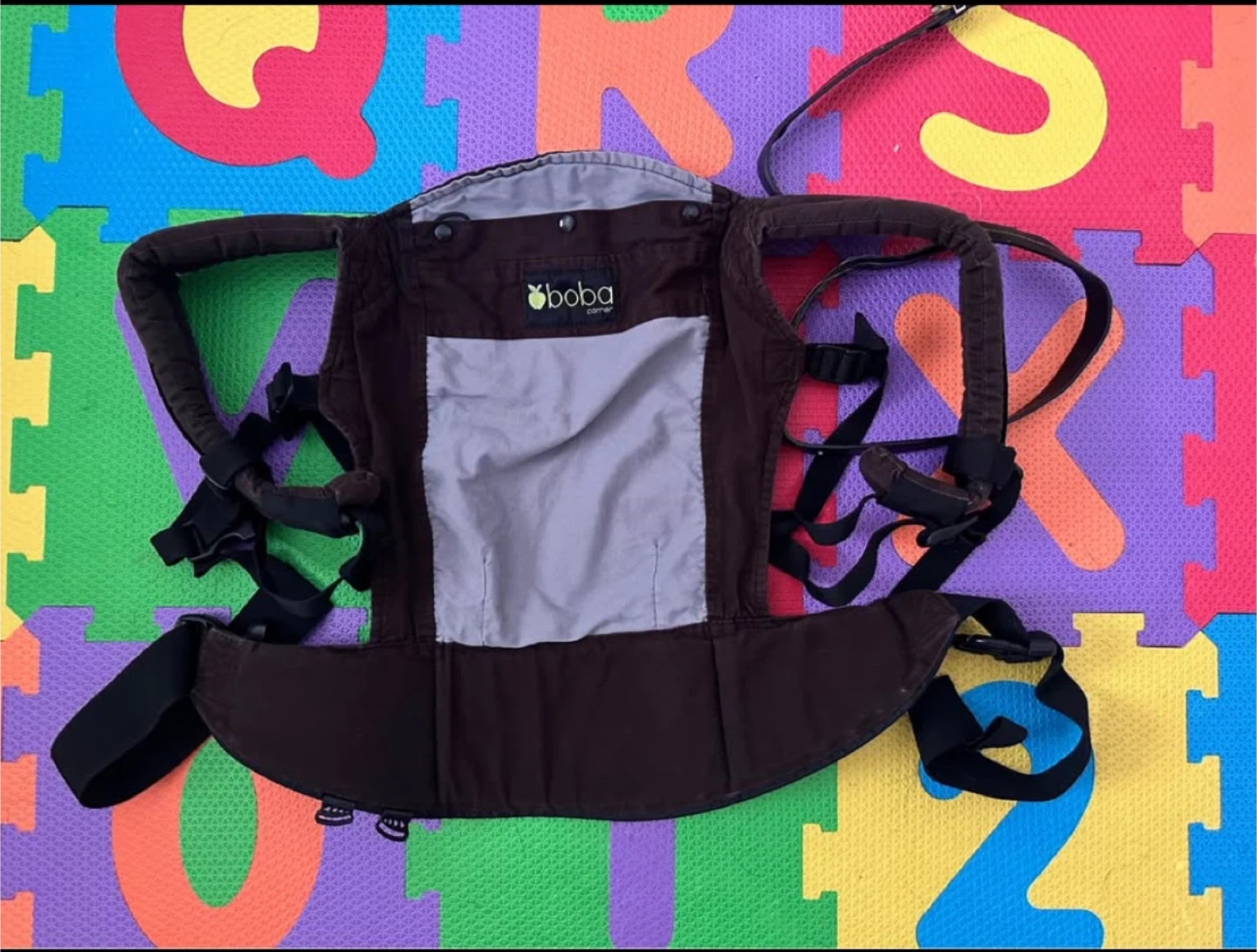This is a brown Boba baby carrier. It features padded shoulder straps and an adjustable waistband for comfort. This carrier is suitable for carrying infants and toddlers.