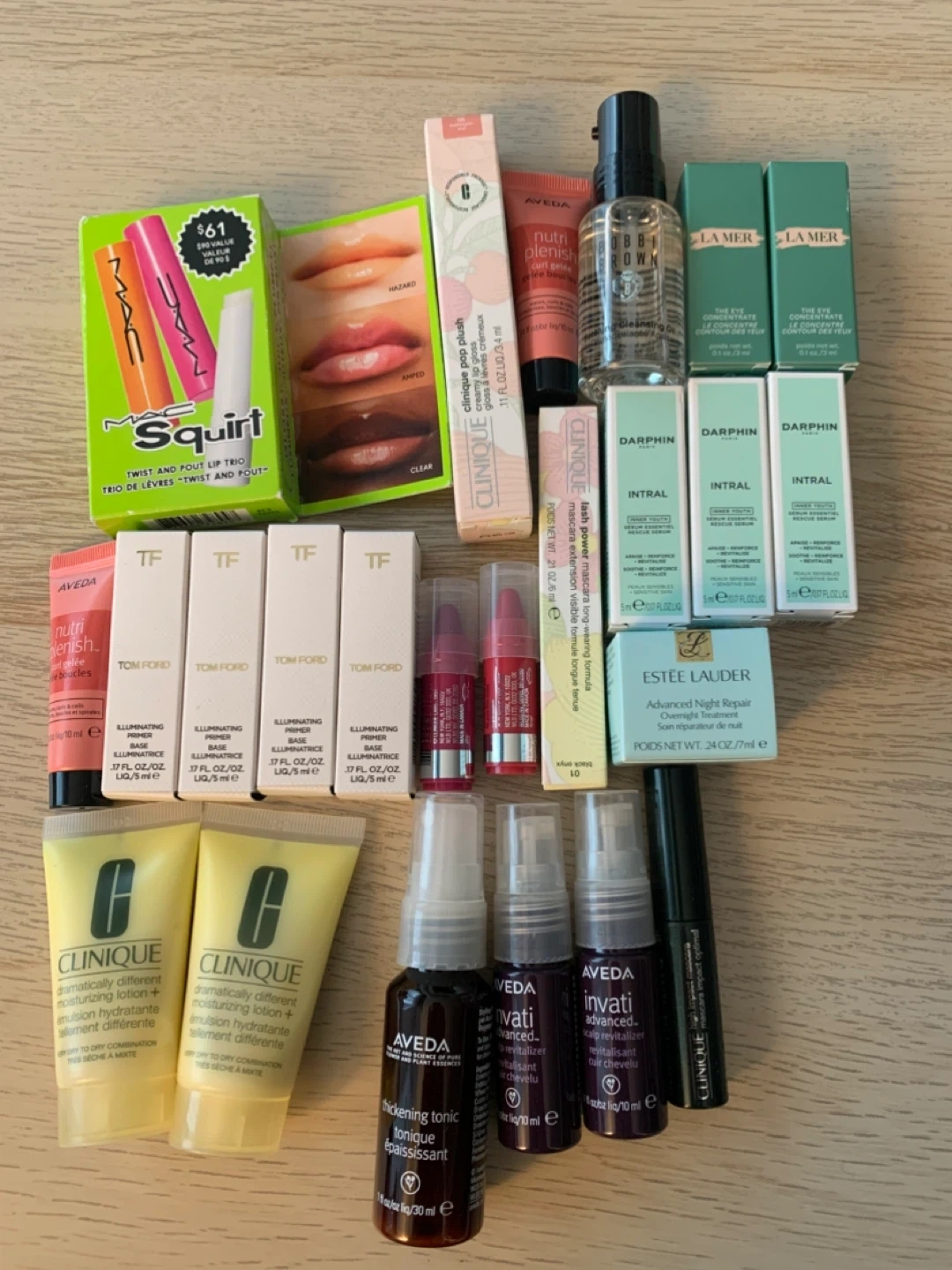 This is a collection of various makeup and skincare items from brands like Clinique, MAC, Tom Ford, Estée Lauder, La Mer, Darphin, and Aveda. It includes lipsticks, toners, moisturizers, eye creams, and more, some with original packaging. Perfect for trying out premium beauty products!