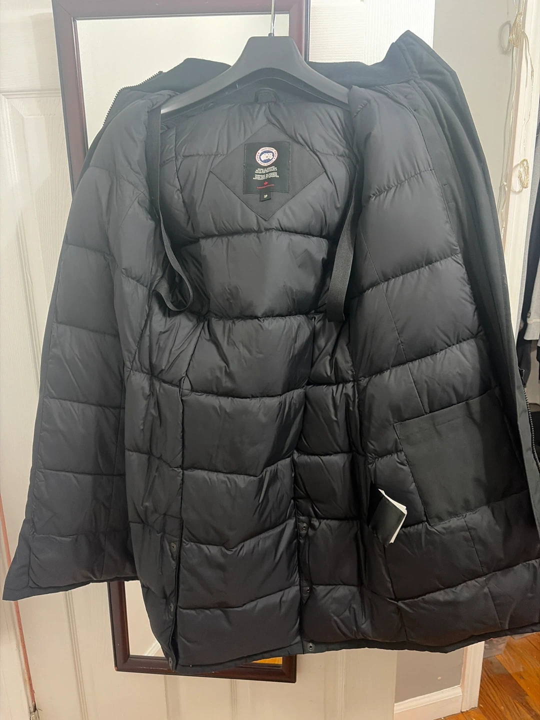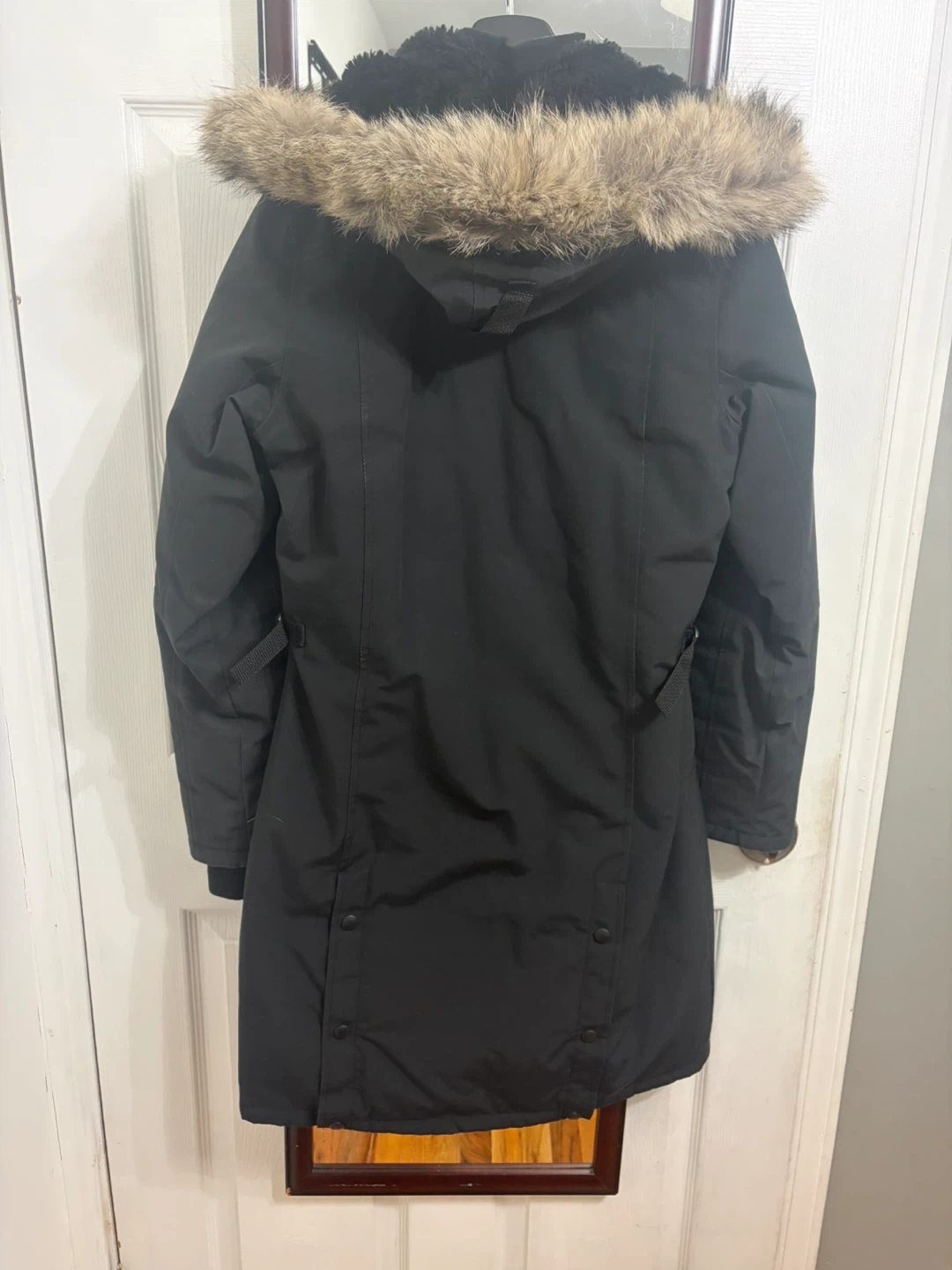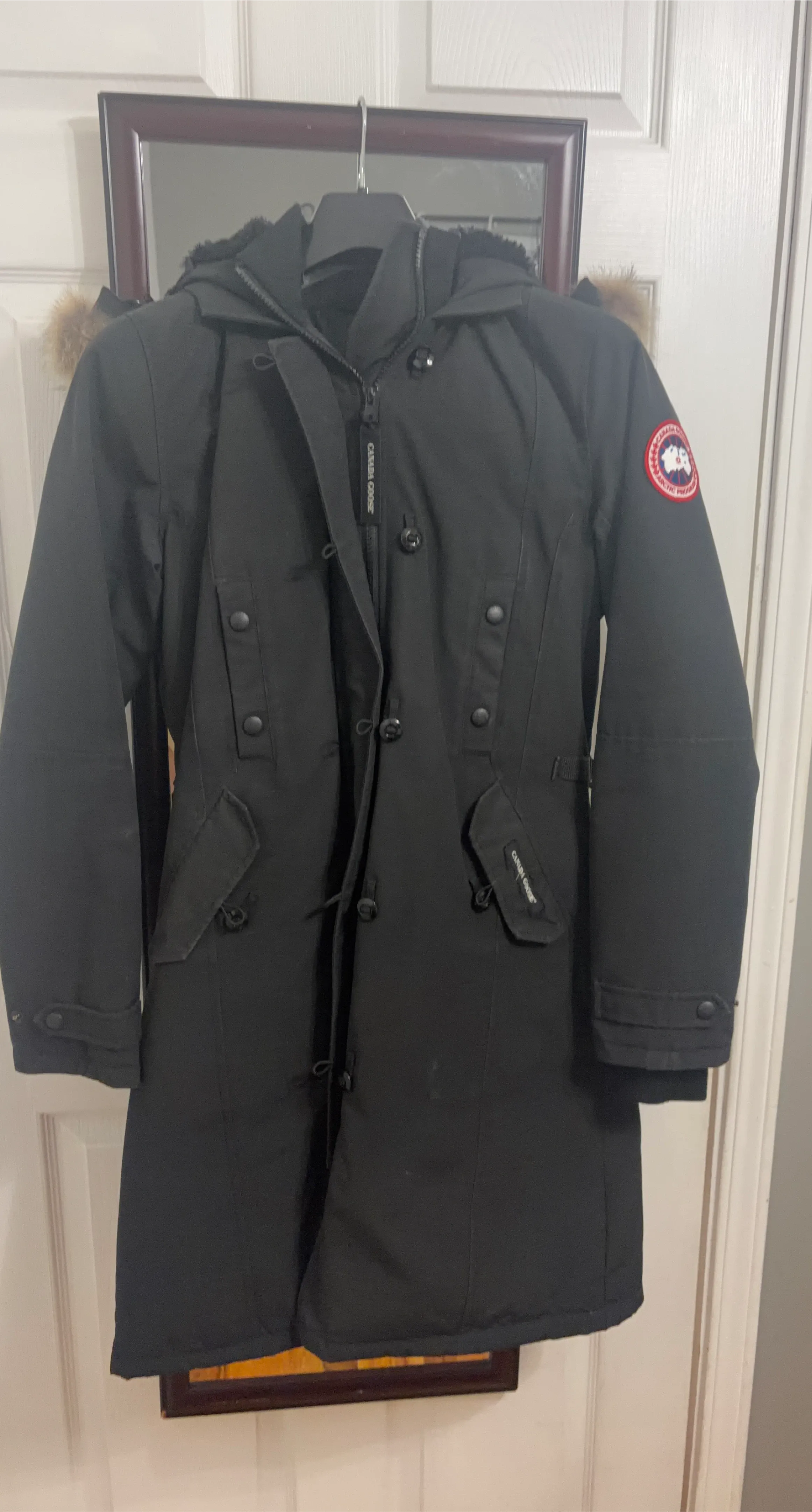 This is a black Canada Goose parka jacket. It's made in Canada with domestic and imported materials. The size is S/P. It features a fur-lined hood.no Canada Goose bag for coat.