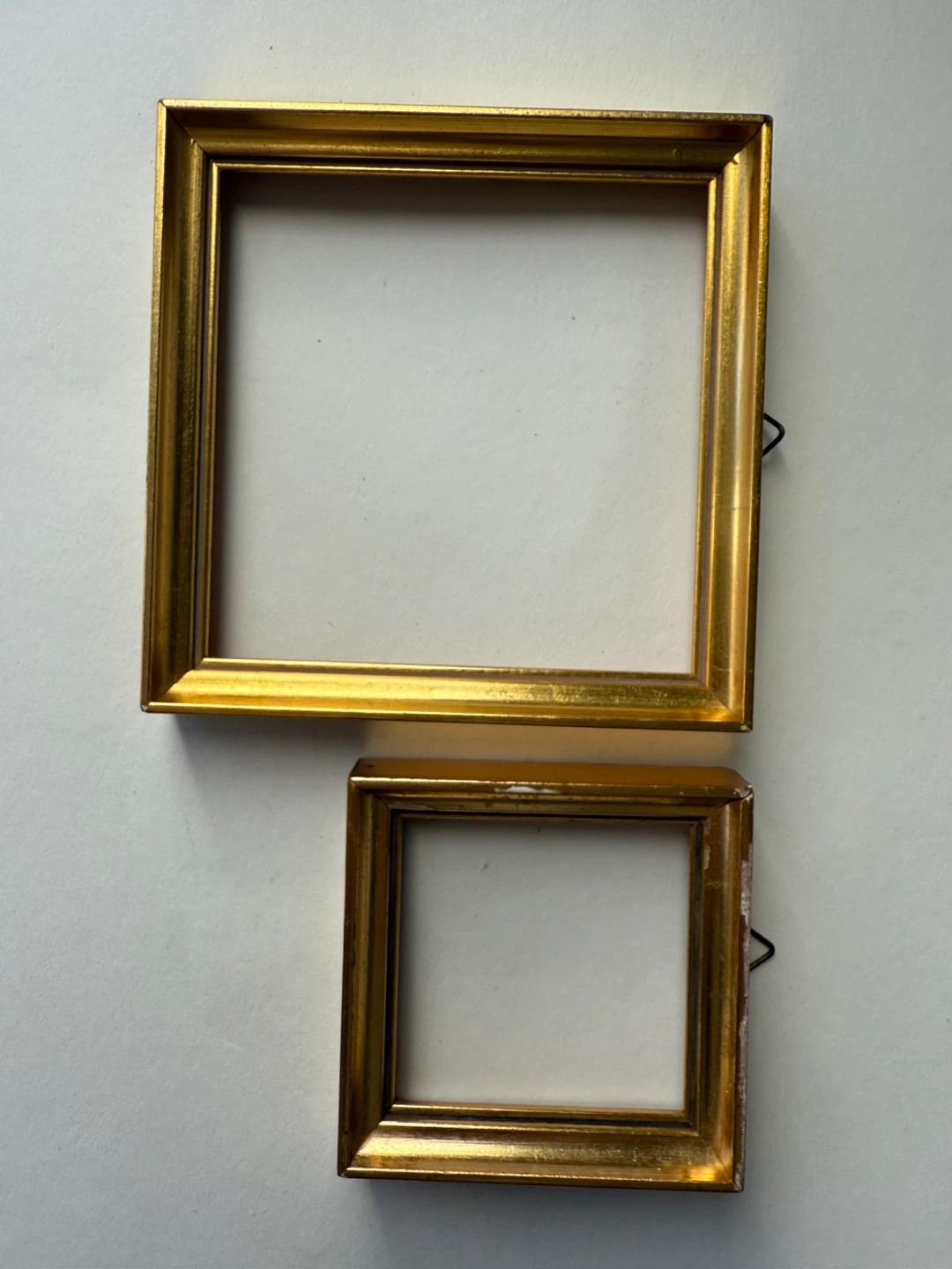 Smaller is 3 ¼” x 3 ¼”, larger is 4 ⅞” x 4 ⅞”