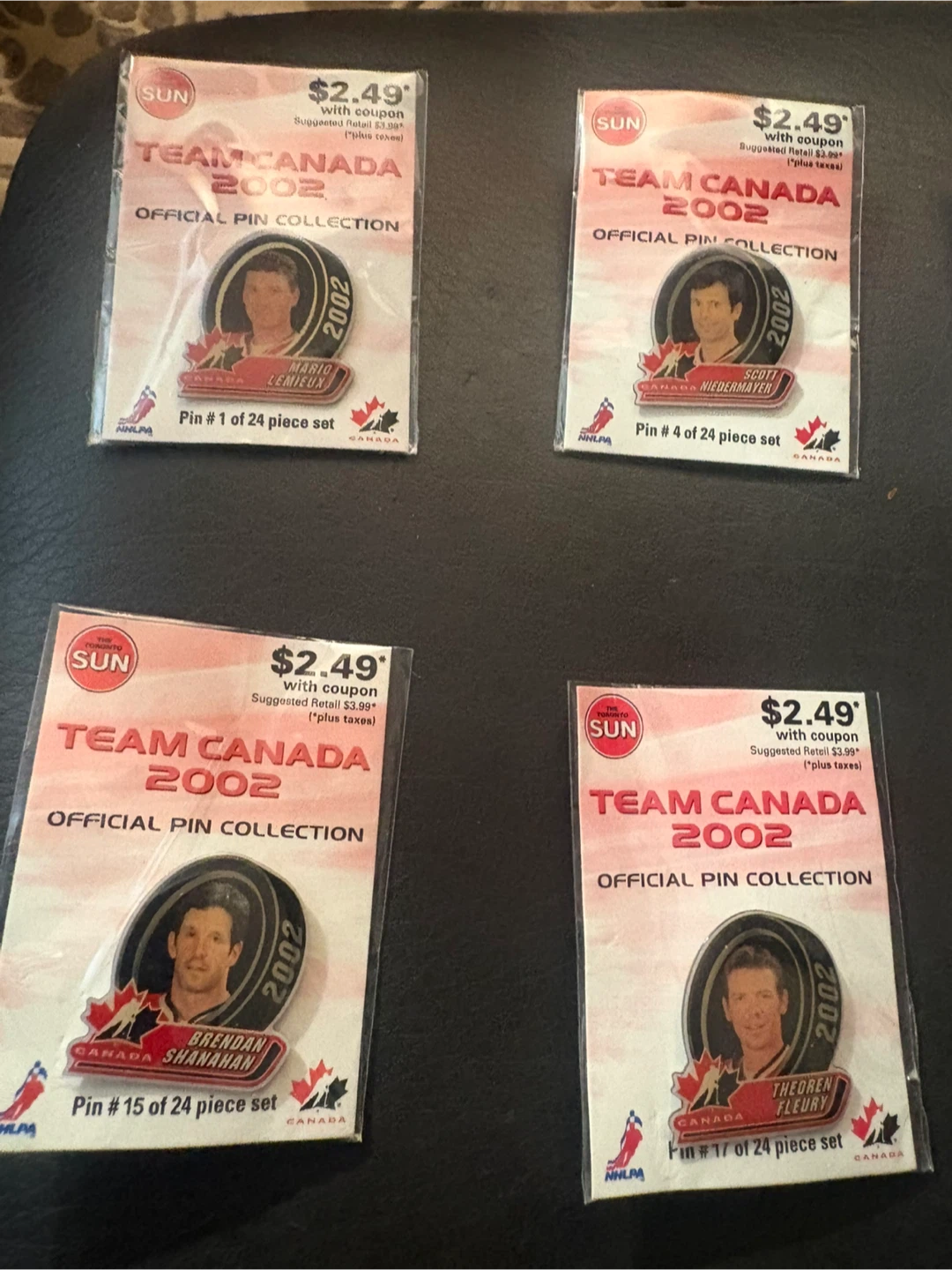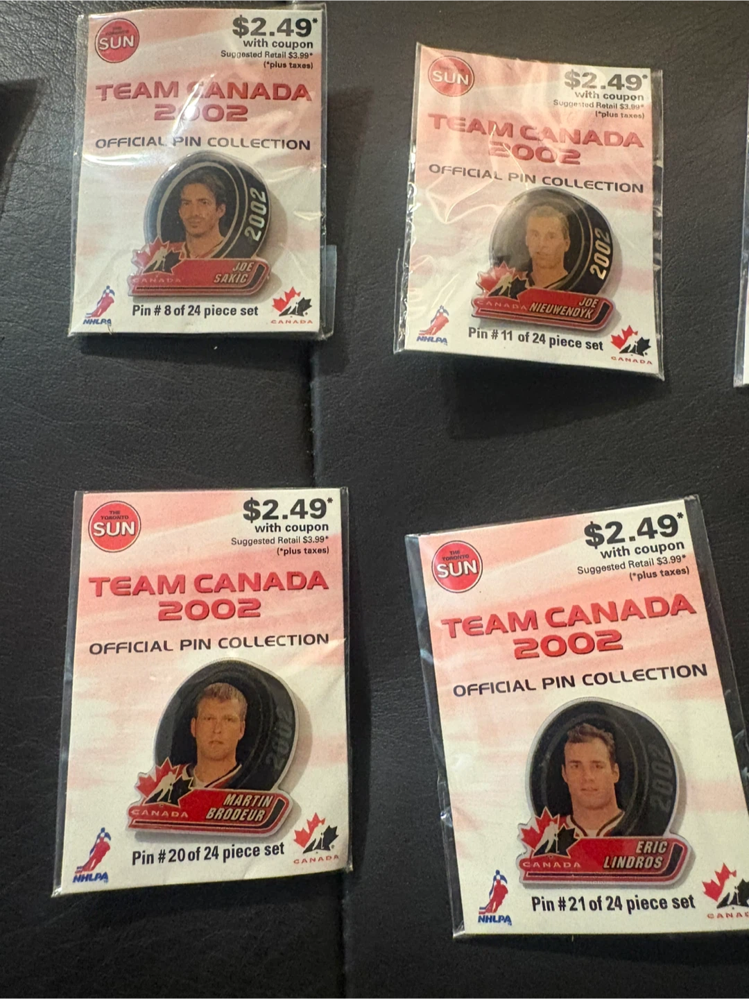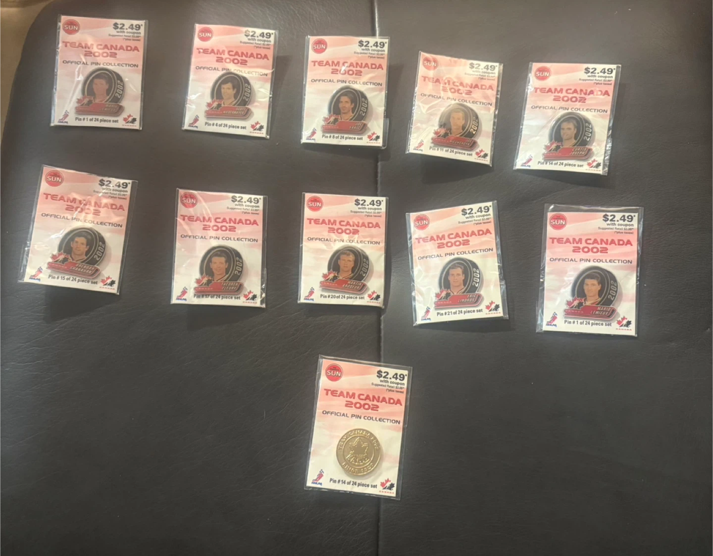This is a collection of Team Canada 2002 official pins. Each pin is part of a 24-piece set, featuring various Canadian athletes. They're great for collectors or any fan of Canadian hockey!
