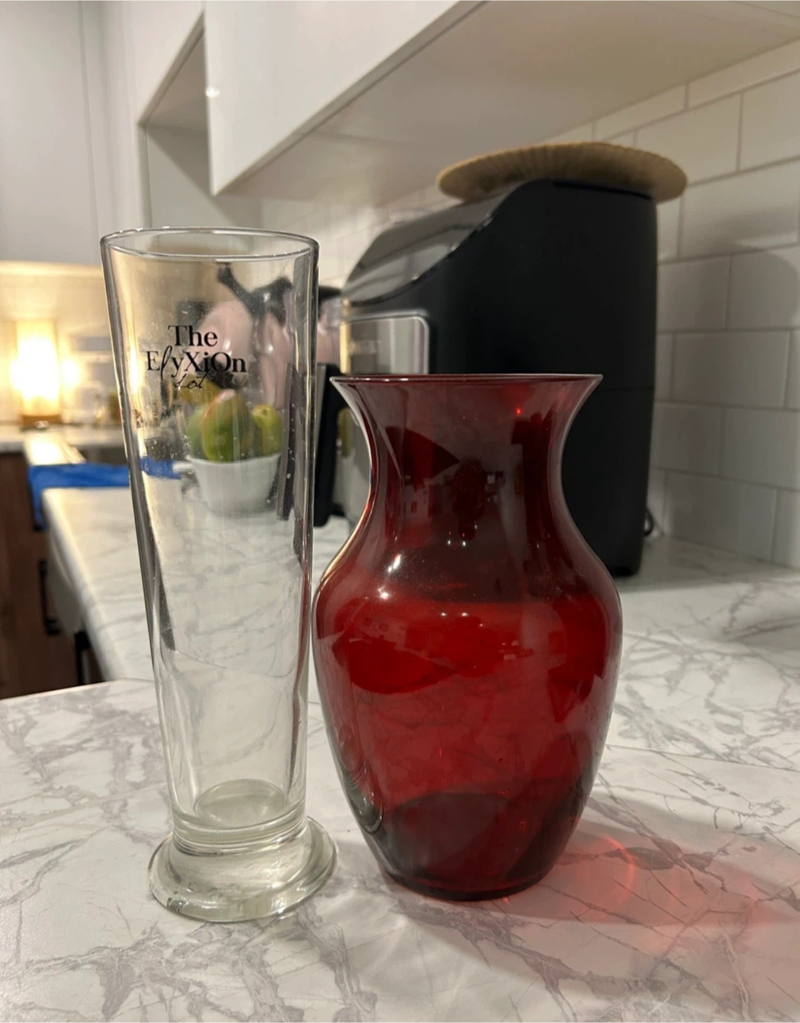 Selling two vases! One is a tall, clear glass vase with a unique design. The other is a beautiful red glass vase. Both are in great condition and would look lovely in any home