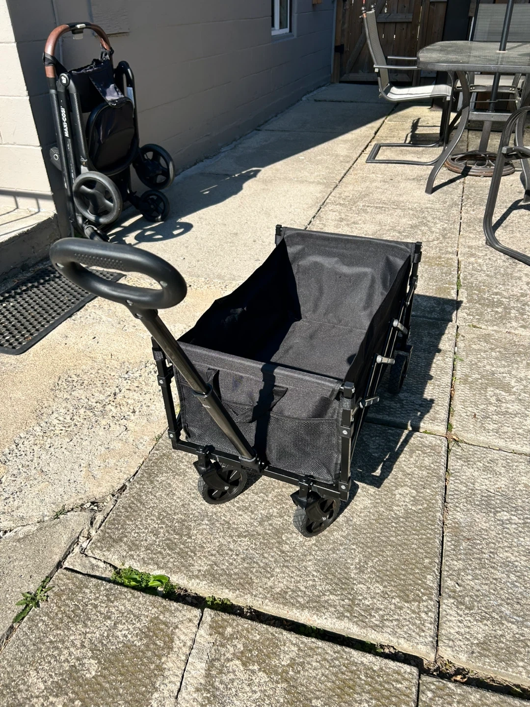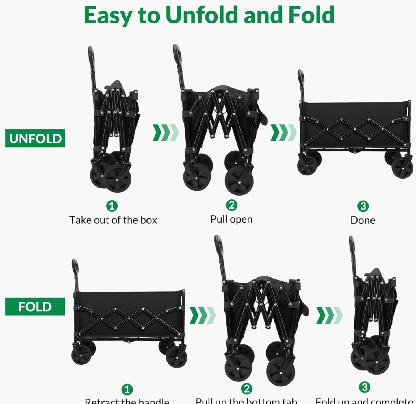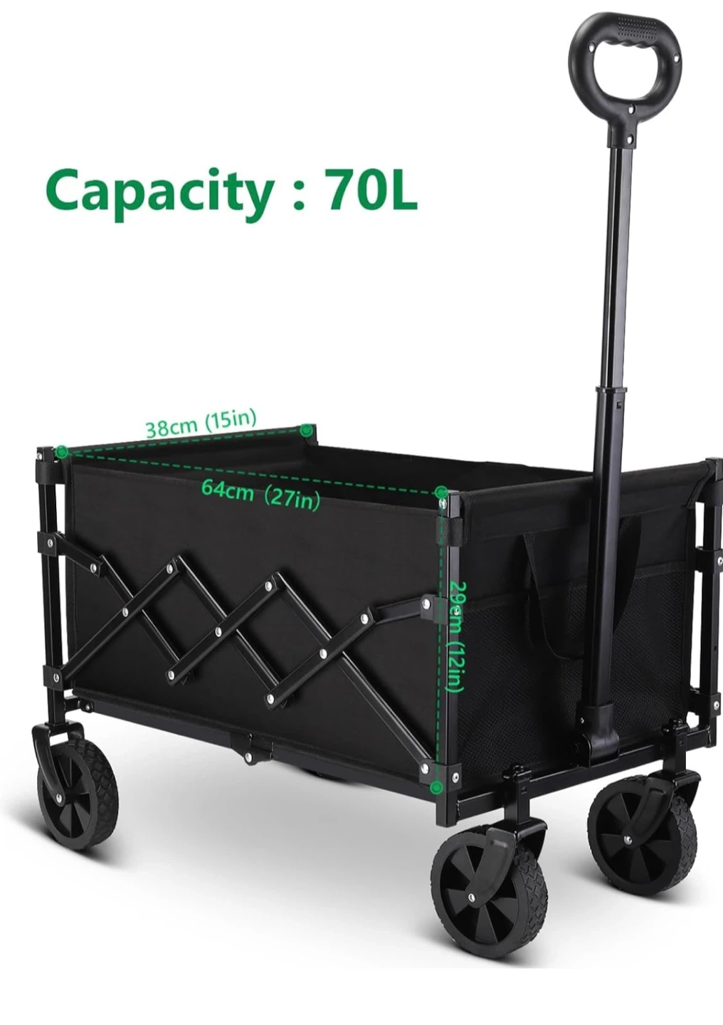 This is a handy collapsible outdoor utility wagon in black! It's easy to unfold and fold, making it great for storage and transport.