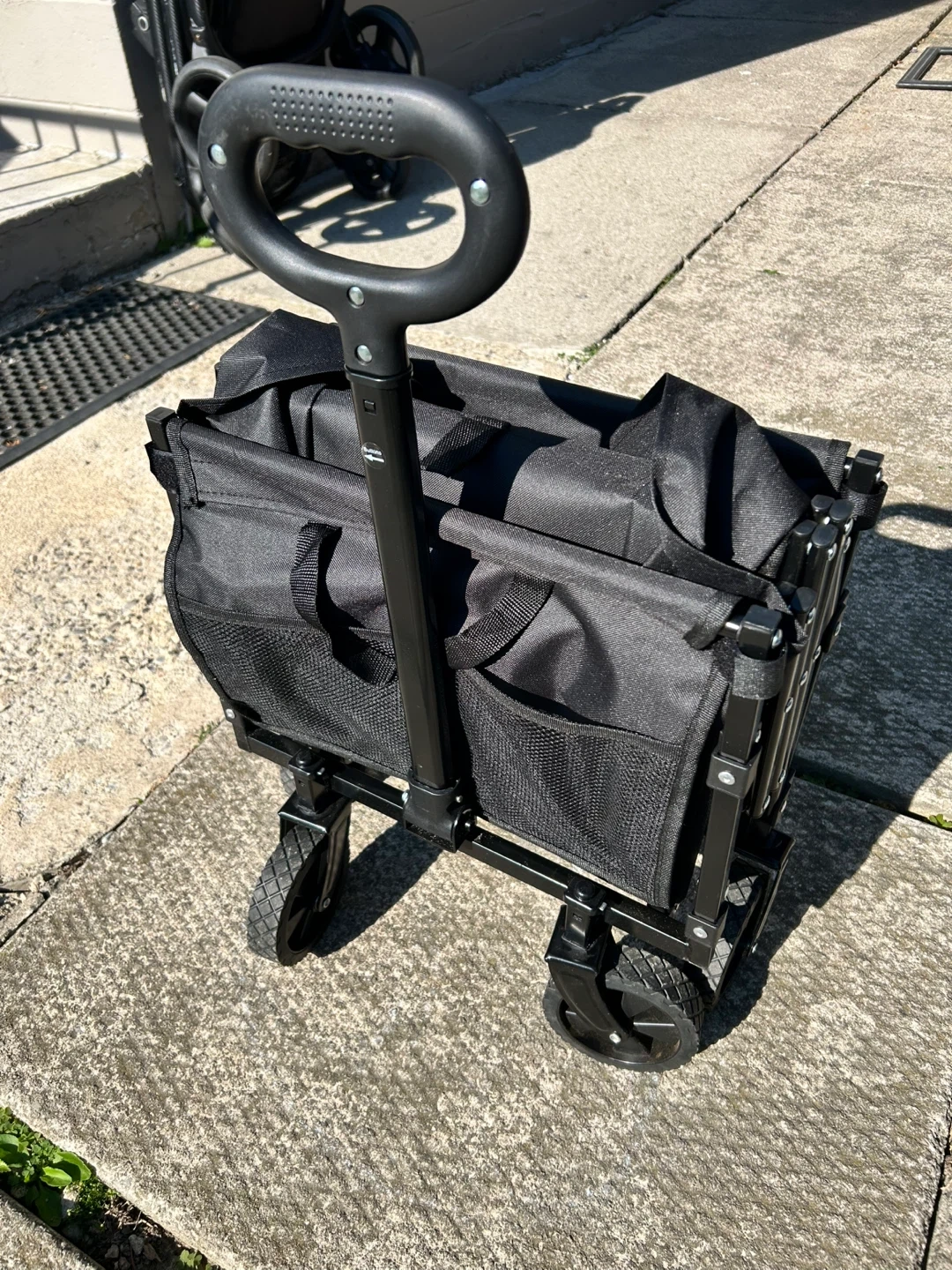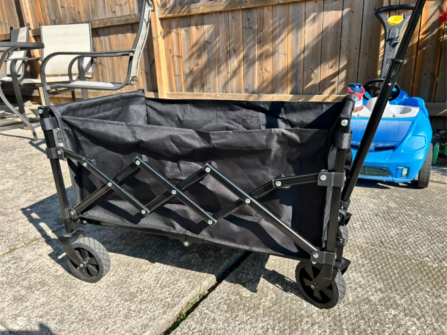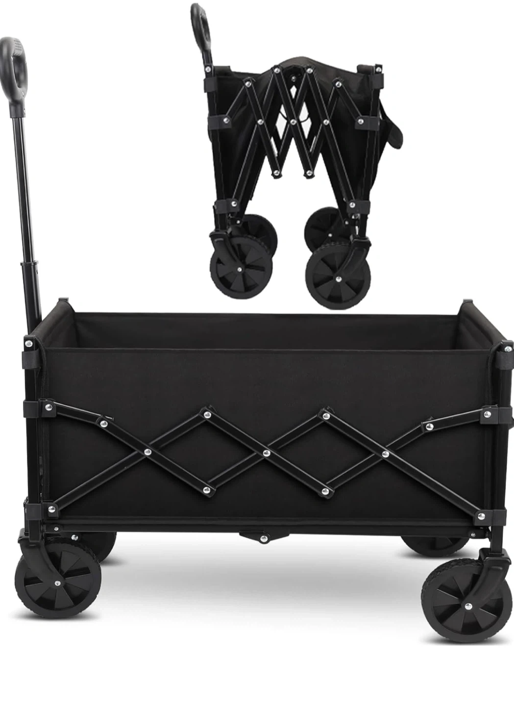 This is a handy collapsible outdoor utility wagon in black! It's easy to unfold and fold, making it great for storage and transport.