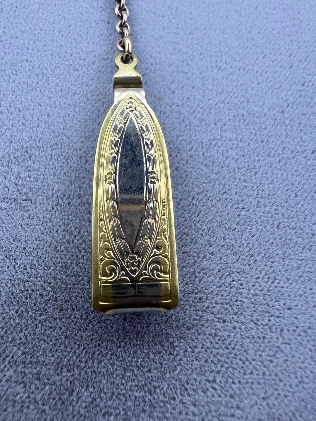The large, decorated clip at the bottom would attach to a gentleman's vest or belt loop, allowing the watch to be kept securely in a pocket while the decorative fob or the chain itself was displayed