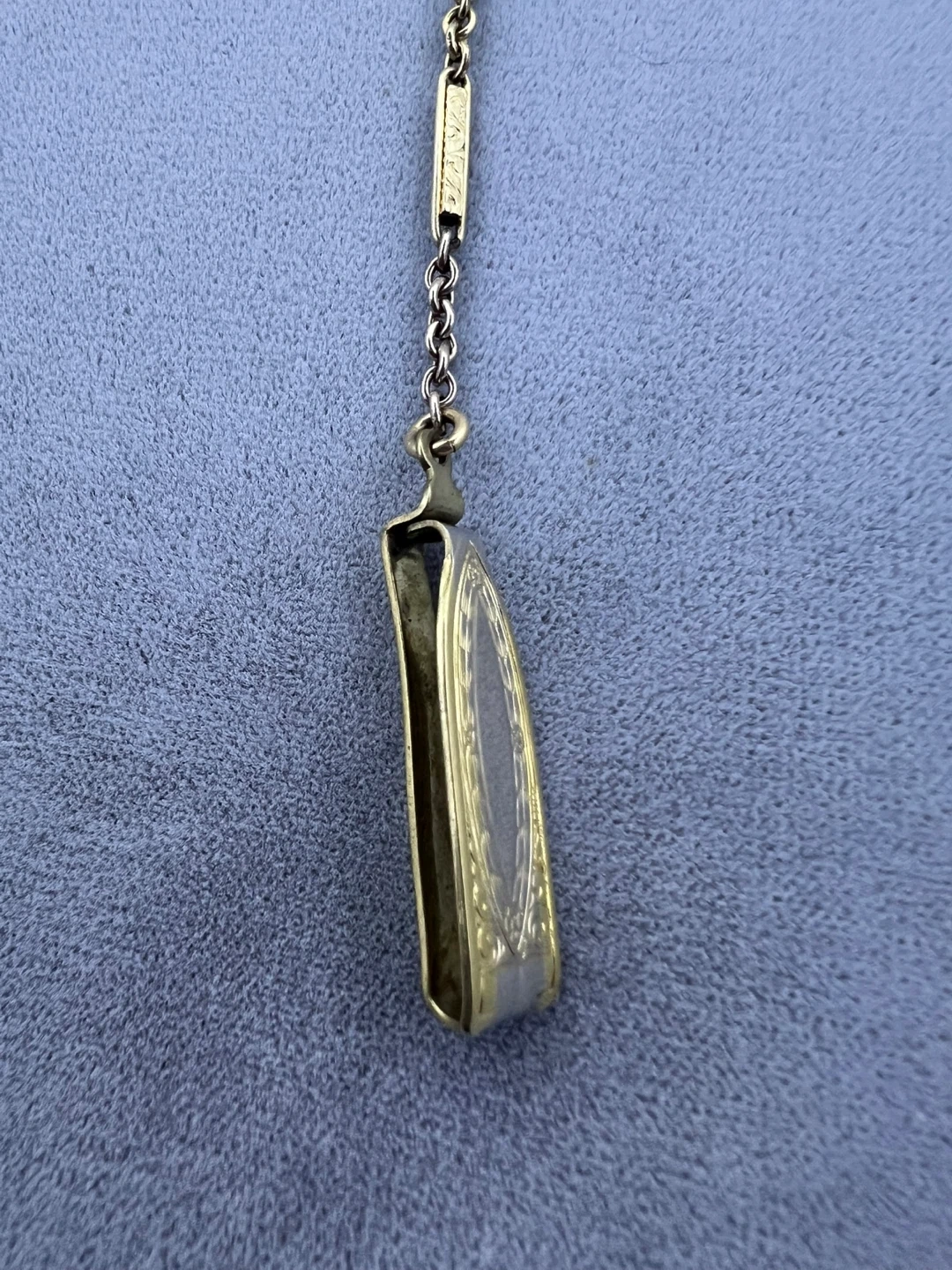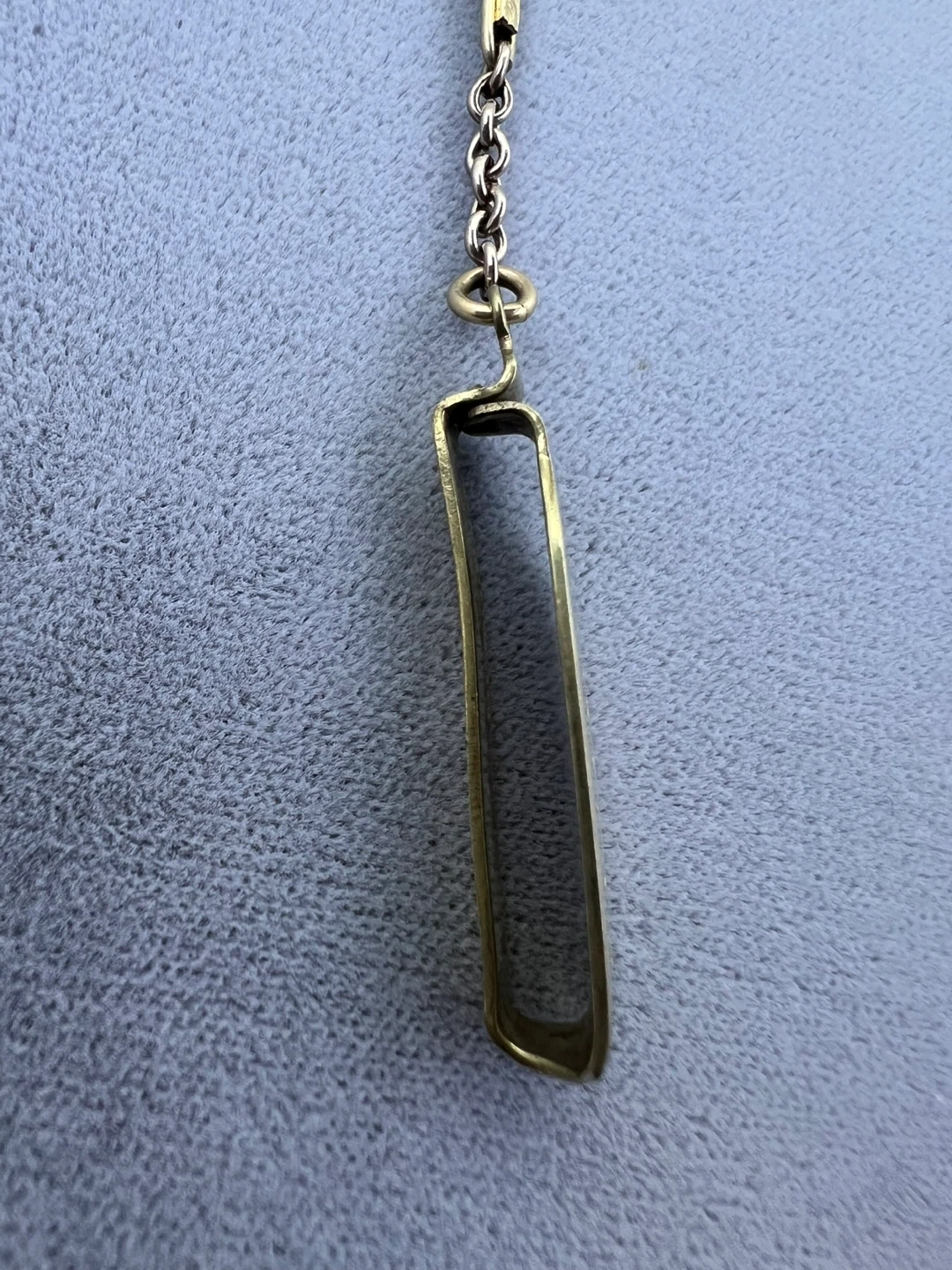 The chain has distinctive, elongated, flat links with etched details