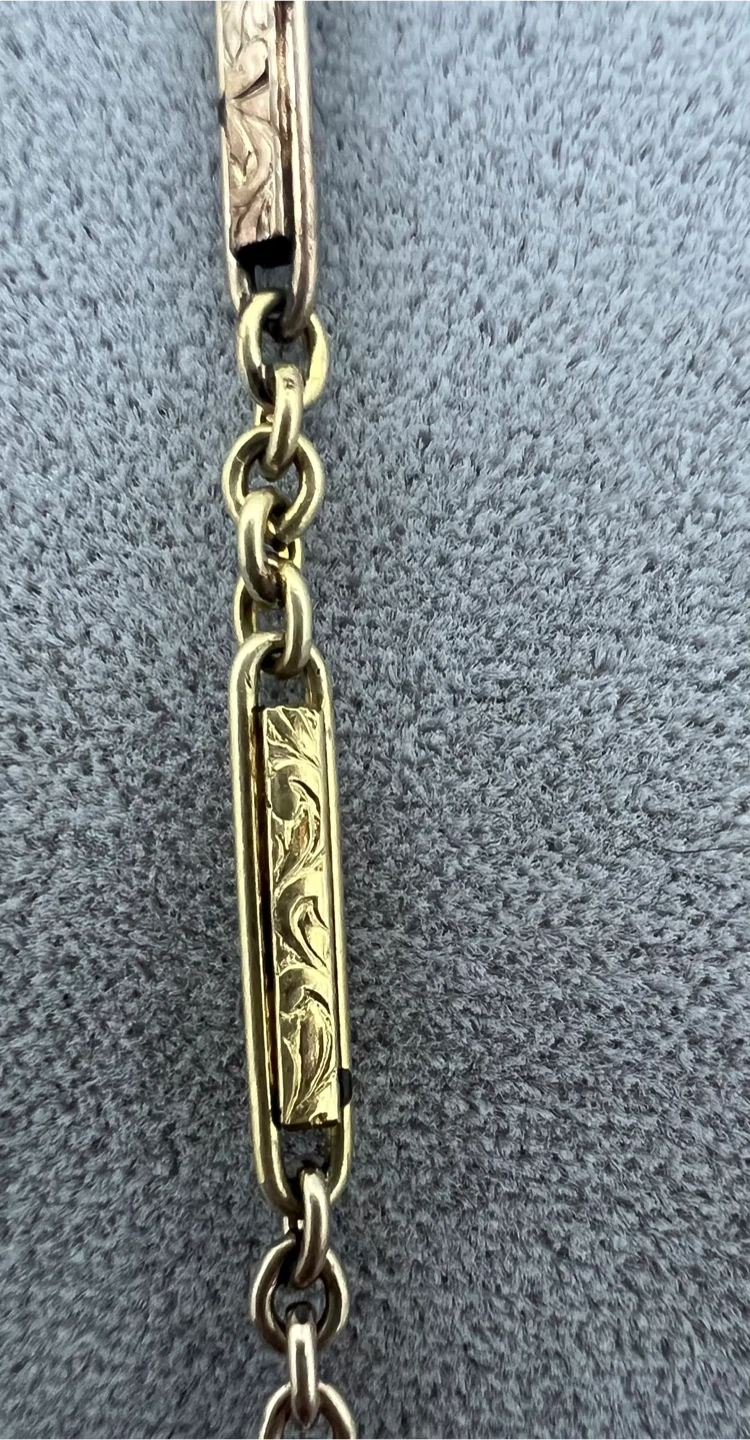 The chain has distinctive, elongated, flat links with etched details