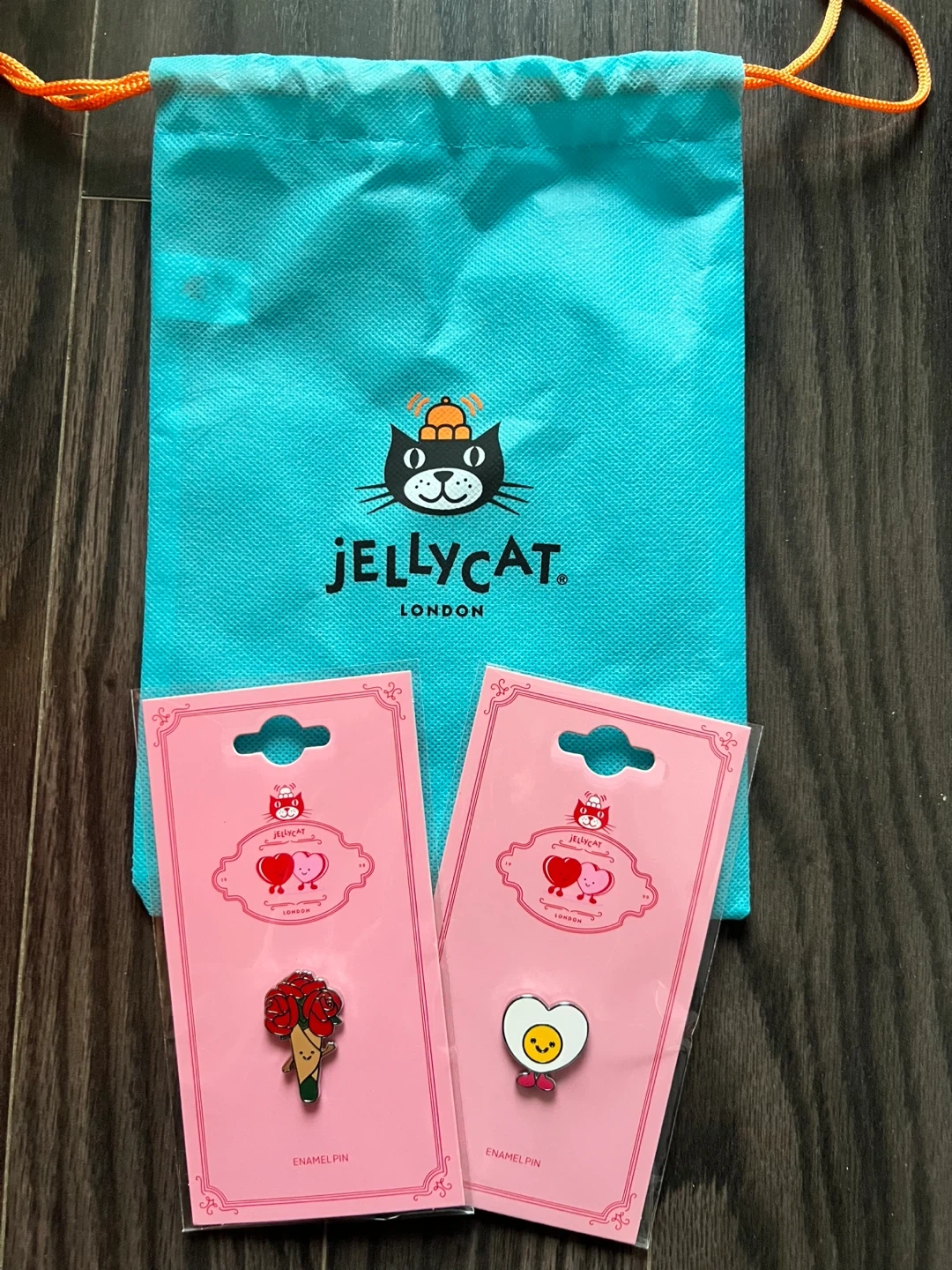 Two cute Jellycat London enamel pins, one features a rose bouquet and the other a smiling fried egg. These are perfect for adding a bit of fun to a jacket or bag! $25 each or $40 for both