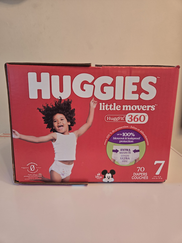 Selling a box of Huggies Little Movers diapers, size 7. These have the HuggFit 360 design for a secure and comfy fit. There are 70 diapers in the box, perfect for babies over 41 lbs (19 kg). They offer up to 100% blowout and leakproof protection!