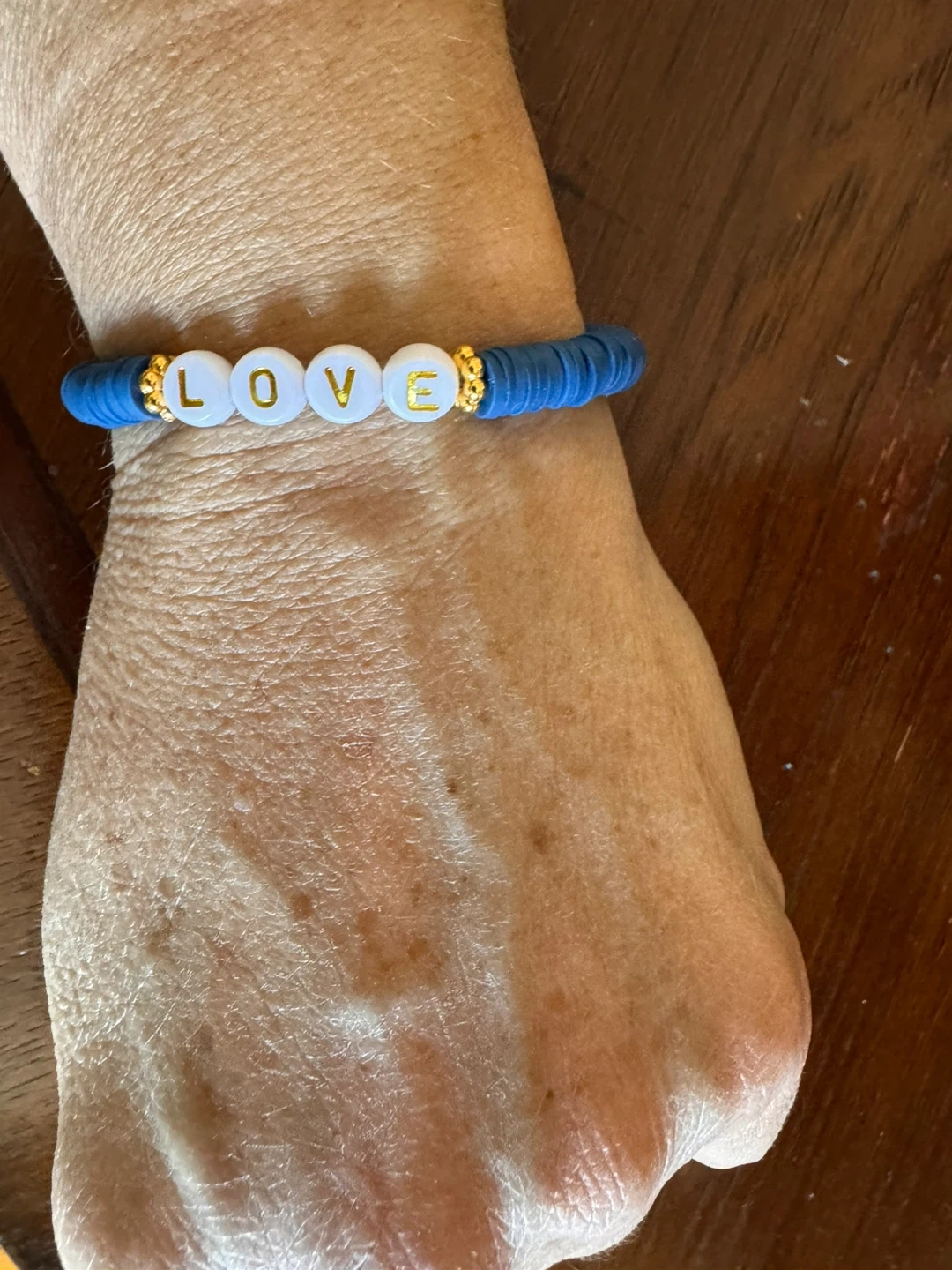 A collection of bracelets. One features an assortment of colourful, natural gemstones. Another has blue disc beads spelling out "LOVE" with gold accents. And much more…