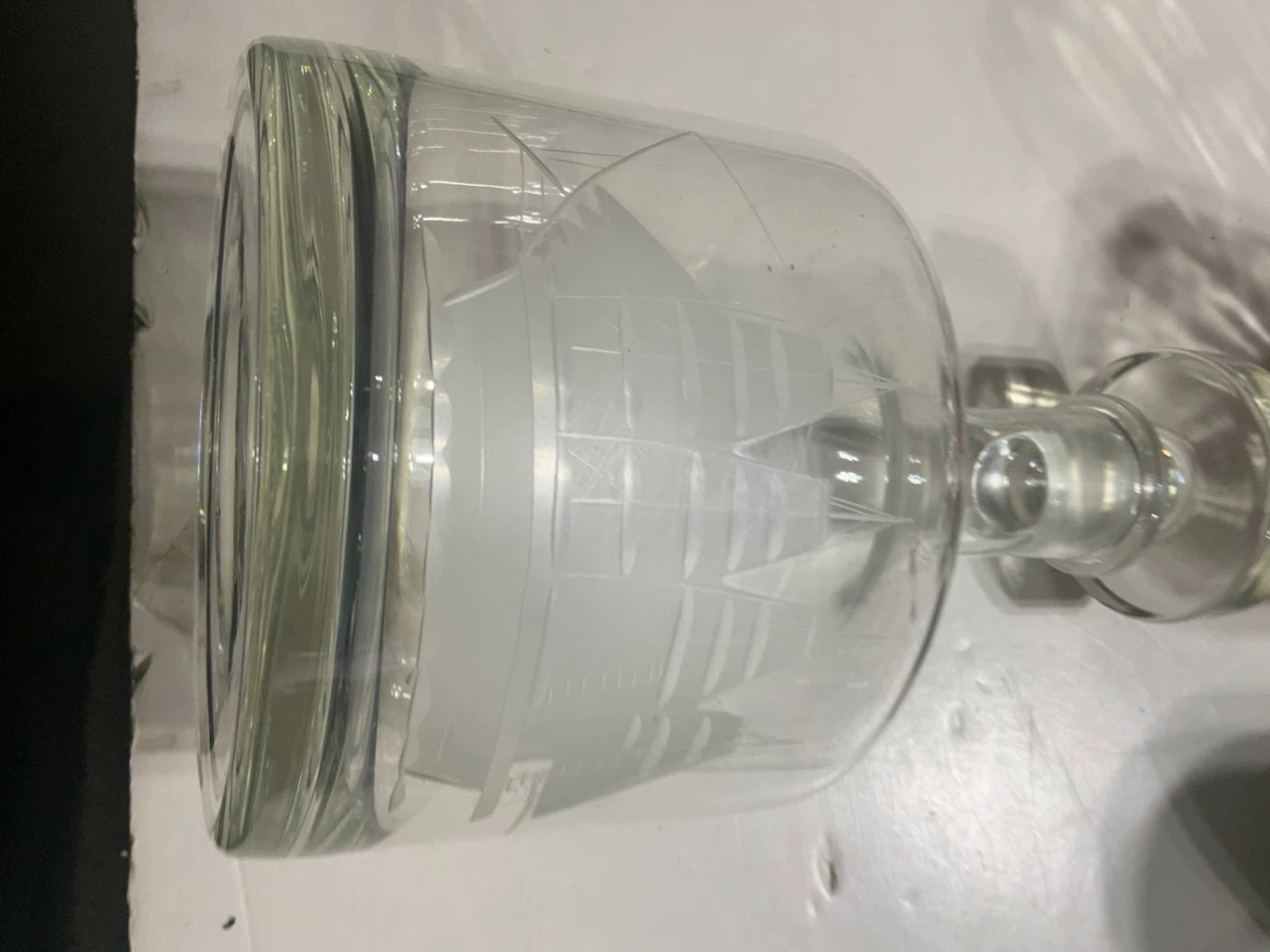 This glass decanter features an etched design of sailing ships. It has a stoppable opening for sealing contents. Glass material.