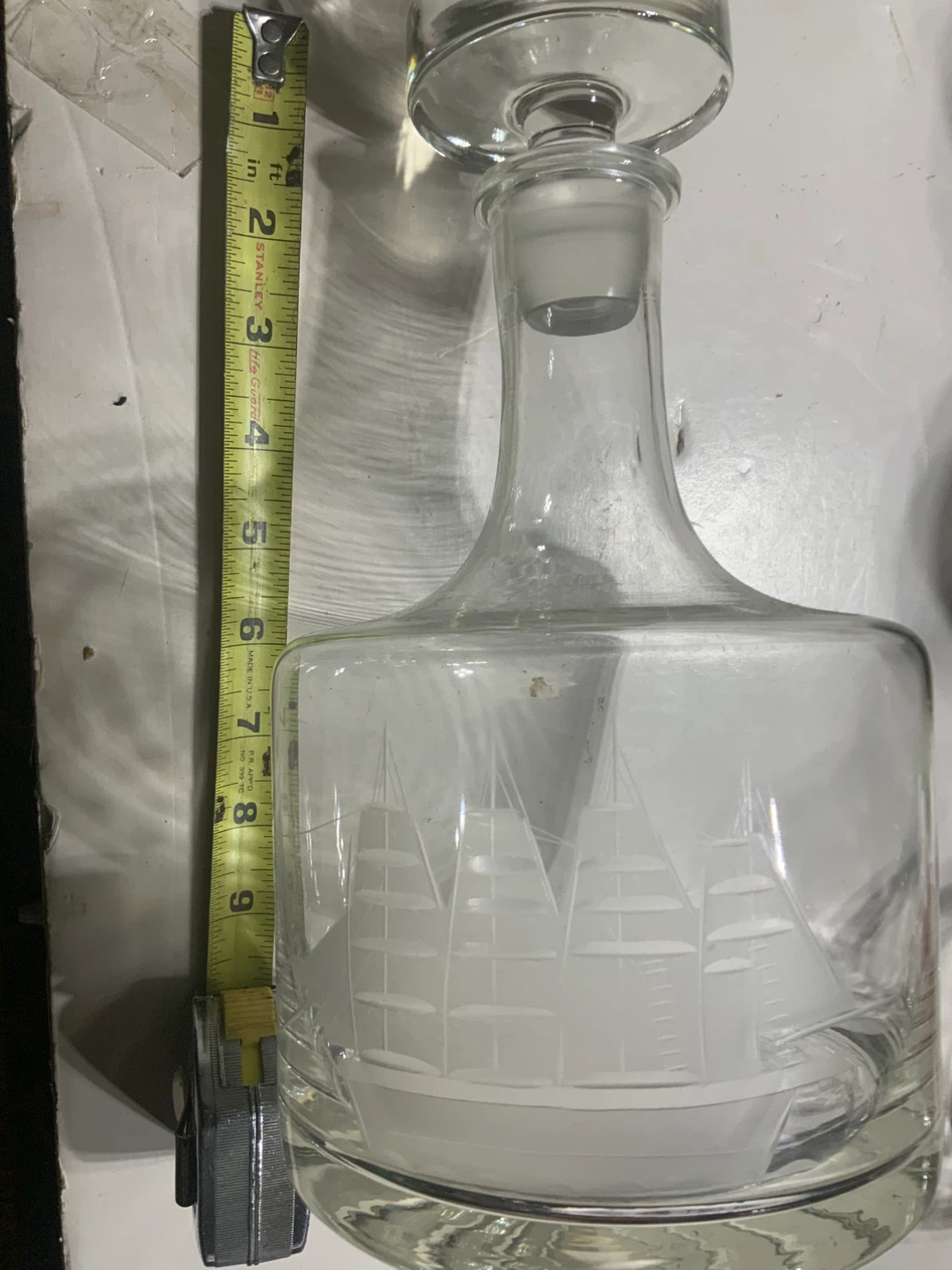 This glass decanter features an etched design of sailing ships. It has a stoppable opening for sealing contents. Glass material.