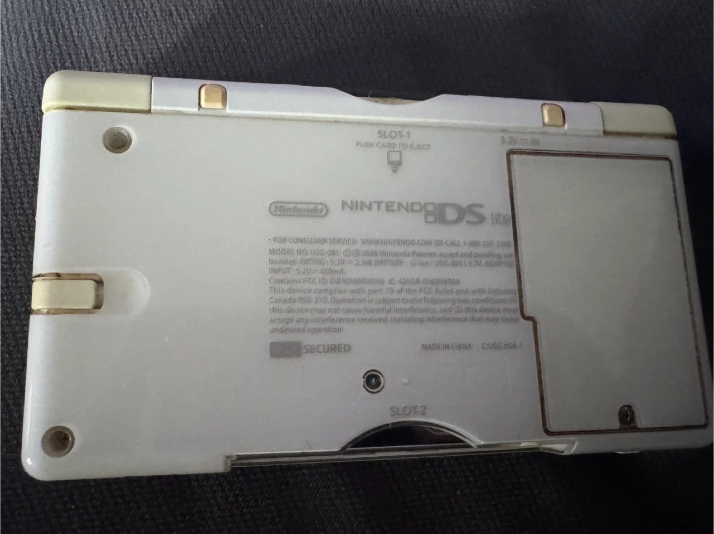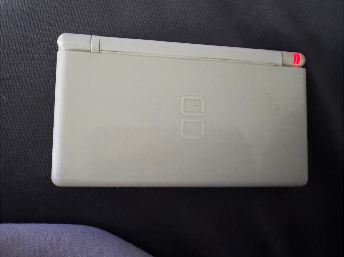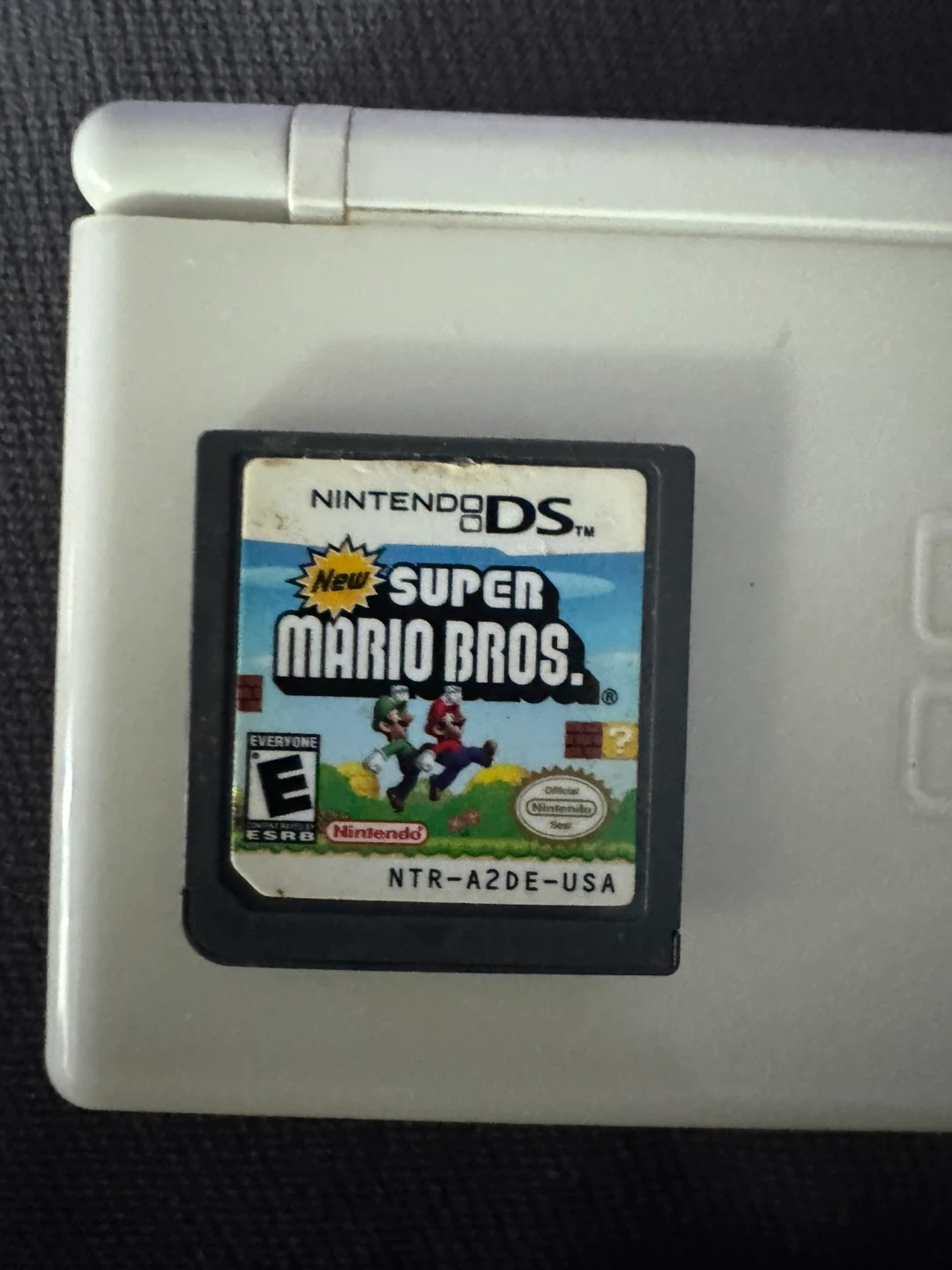 White Nintendo DS Lite handheld console. Includes the game New Super Mario Bros. cartridge. A classic gaming device for on-the-go fun!