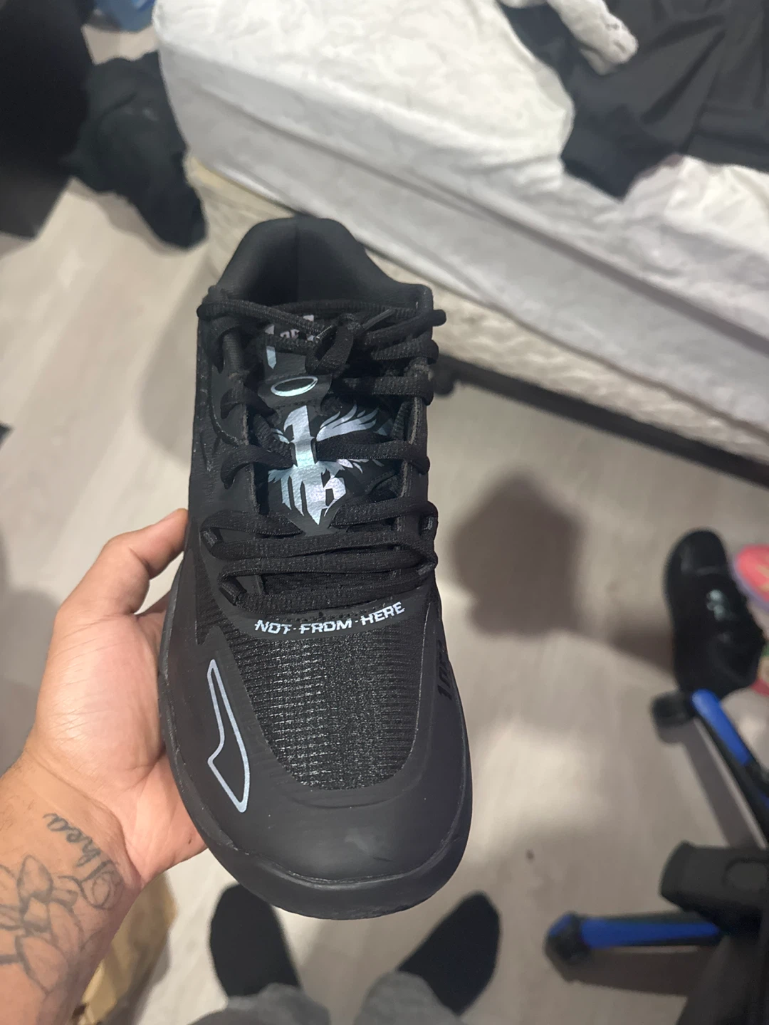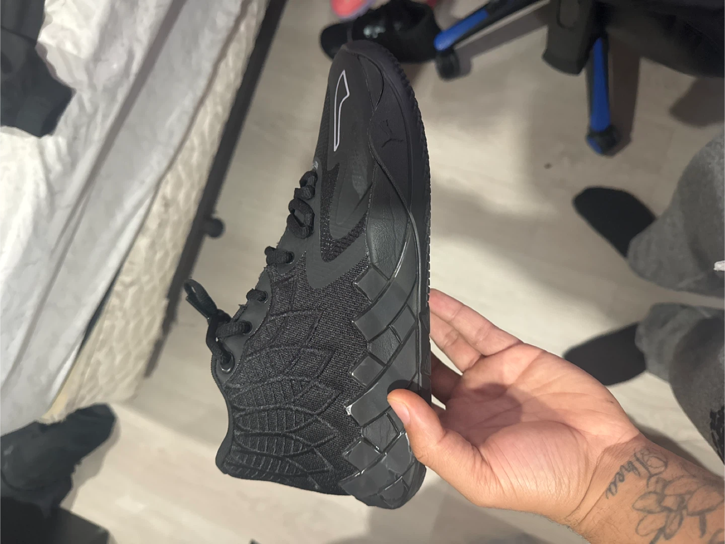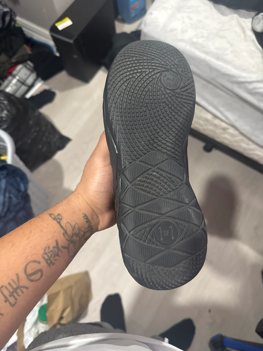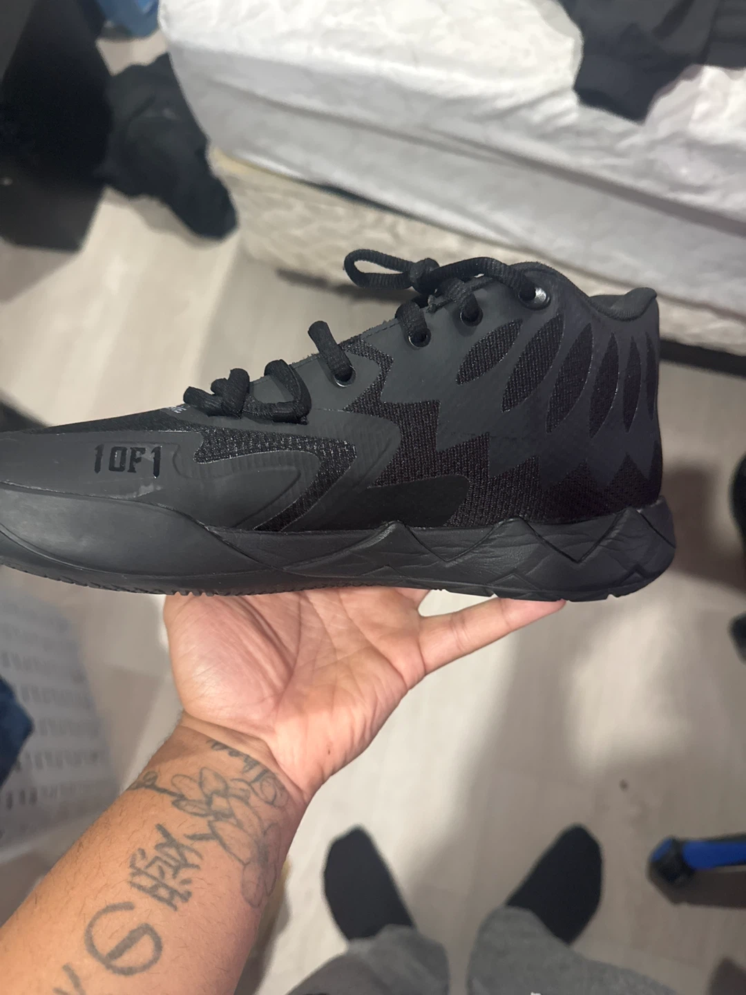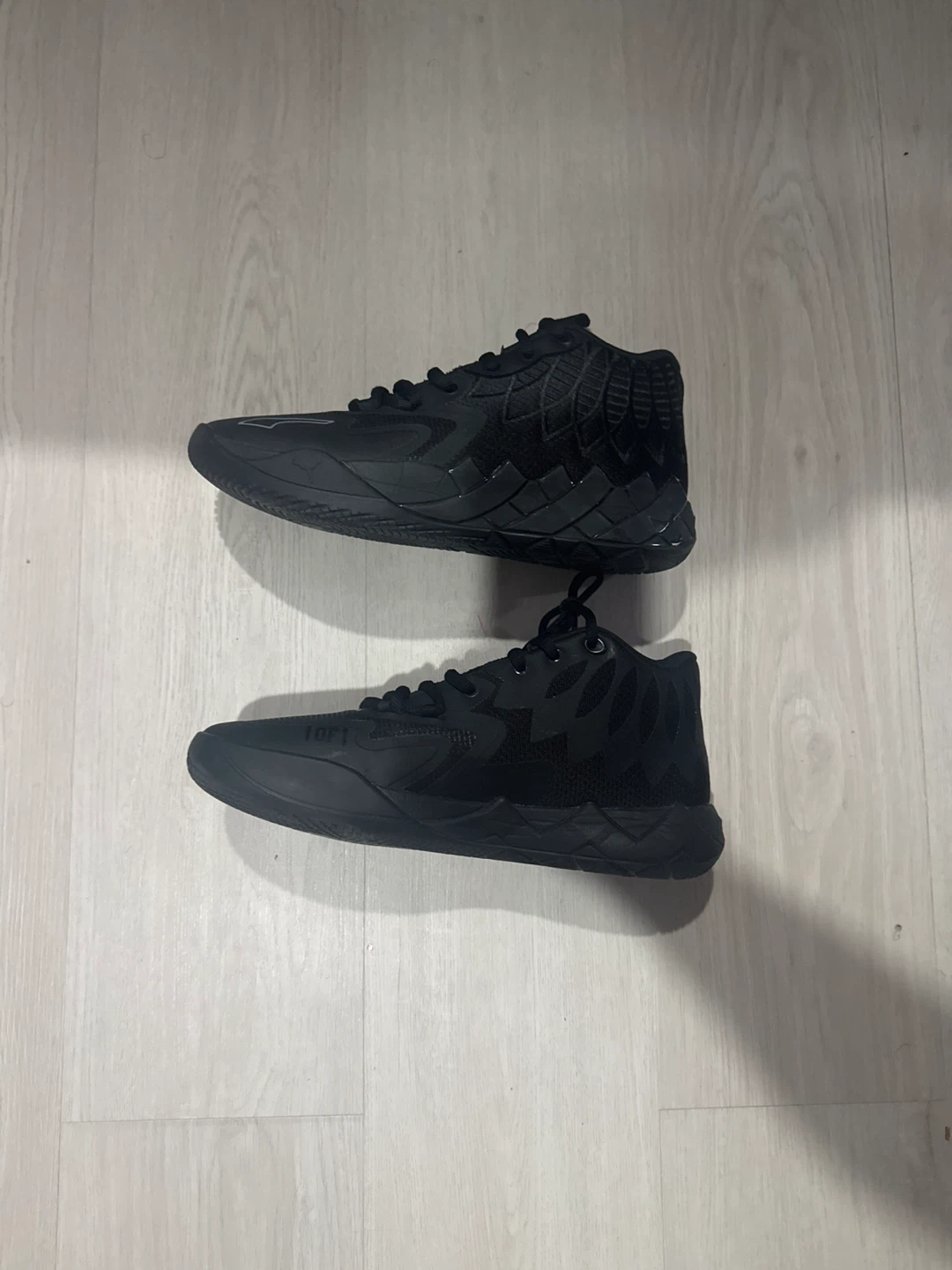 Black lamelo 01 basketball shoes. Features a mesh and synthetic upper with a rubber sole for traction. Includes original box and extra laces. Perfect for the court! Size 10