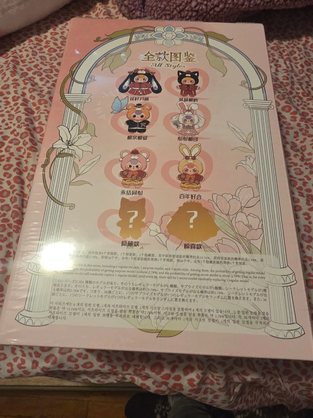 This is a blind box toy featuring characters with a romantic wedding theme. The box contains 12 different designs, with a 2.78% chance of getting a regular model and a 15.74% chance of getting a secret model. It's recommended for ages 15 and up.
