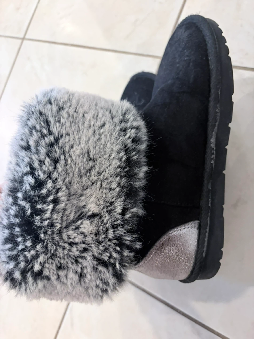 Cozy black winter boots with a stylish faux fur trim! These boots are perfect for keeping your feet warm and looking great during the colder months. They have a silver accent on the heel, adding a touch of sparkle to your winter wardrobe. The boots are in good condition and ready for a new owner!