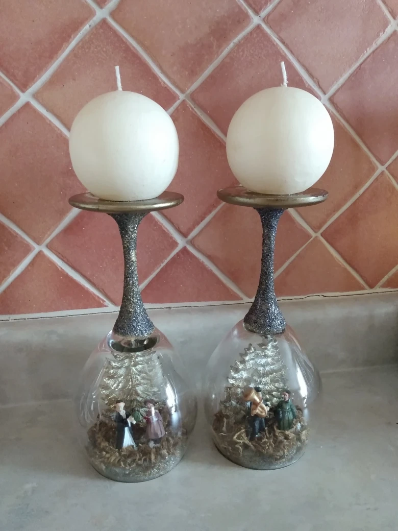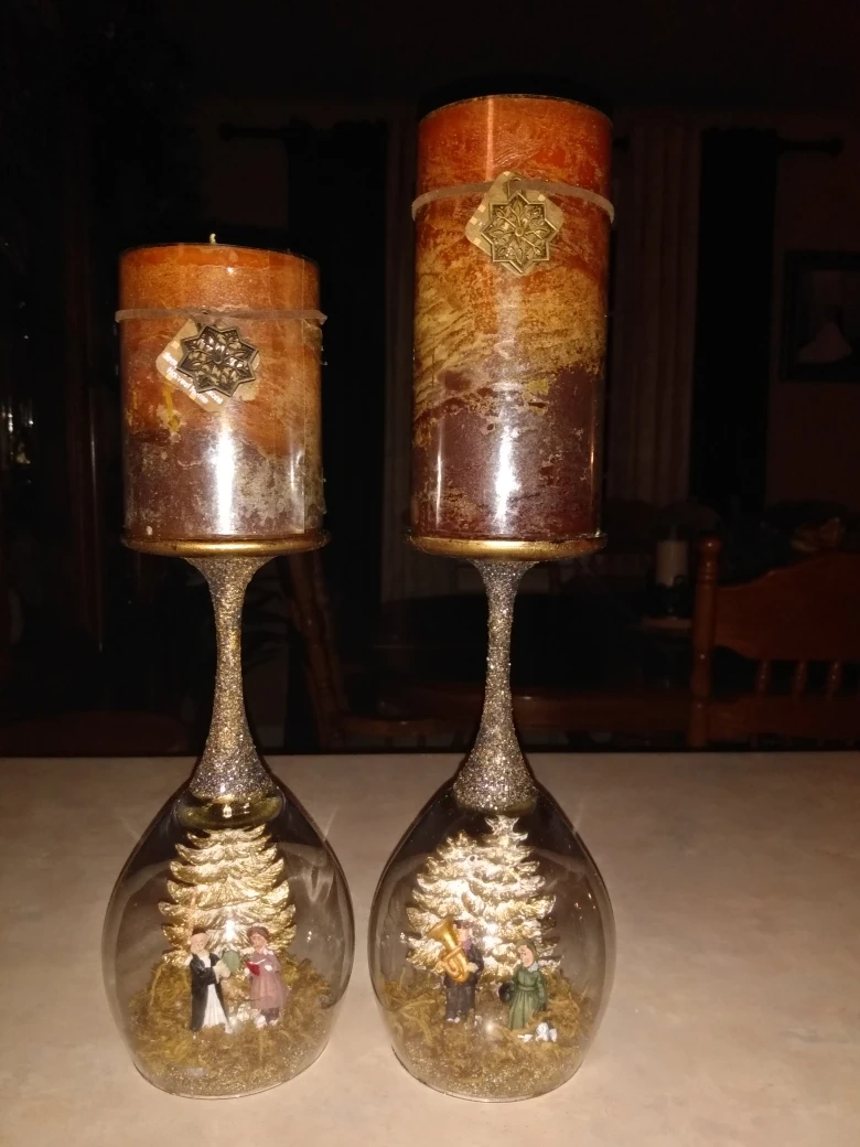 Set of two candle holders with a Christmas theme. Each candle holder includes a small glass wine glass that has been decorated with glitter, gold-coloured straw, and a Christmas tree, along with small figurines. (Cash pick up)