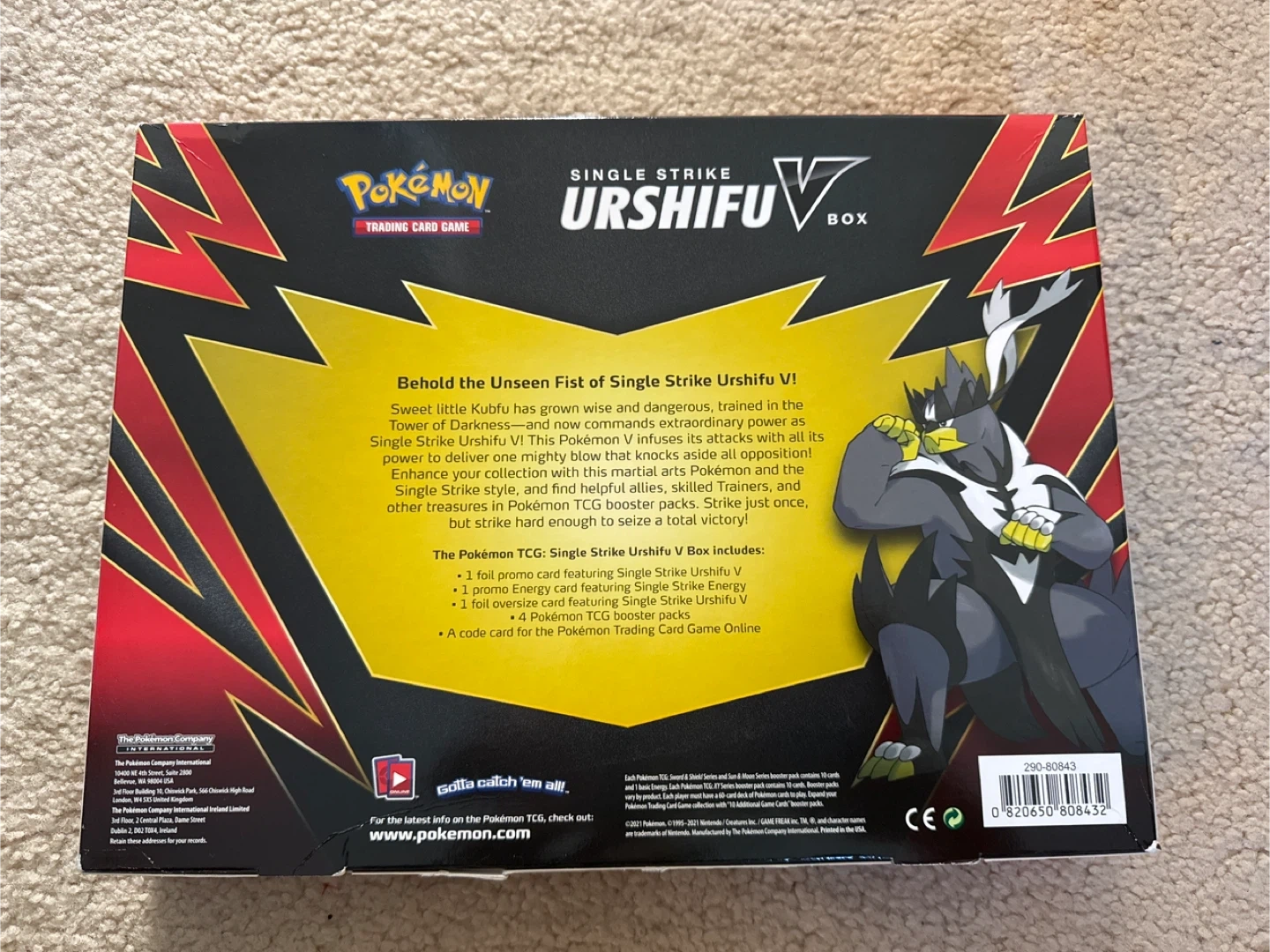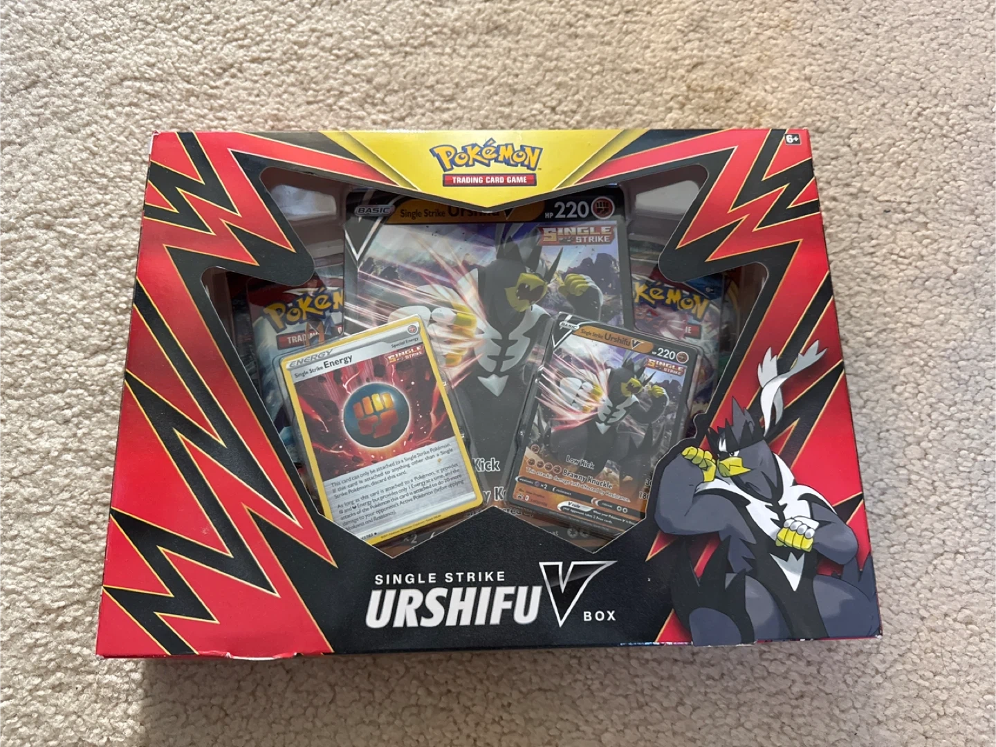 This Pokémon TCG box features Single Strike Urshifu V. It includes 1 promo Energy card, 1 promo foil card, 1 oversized foil card, and 4 Pokémon TCG booster packs. A code card for the Pokémon Trading Card Game Online is also included.