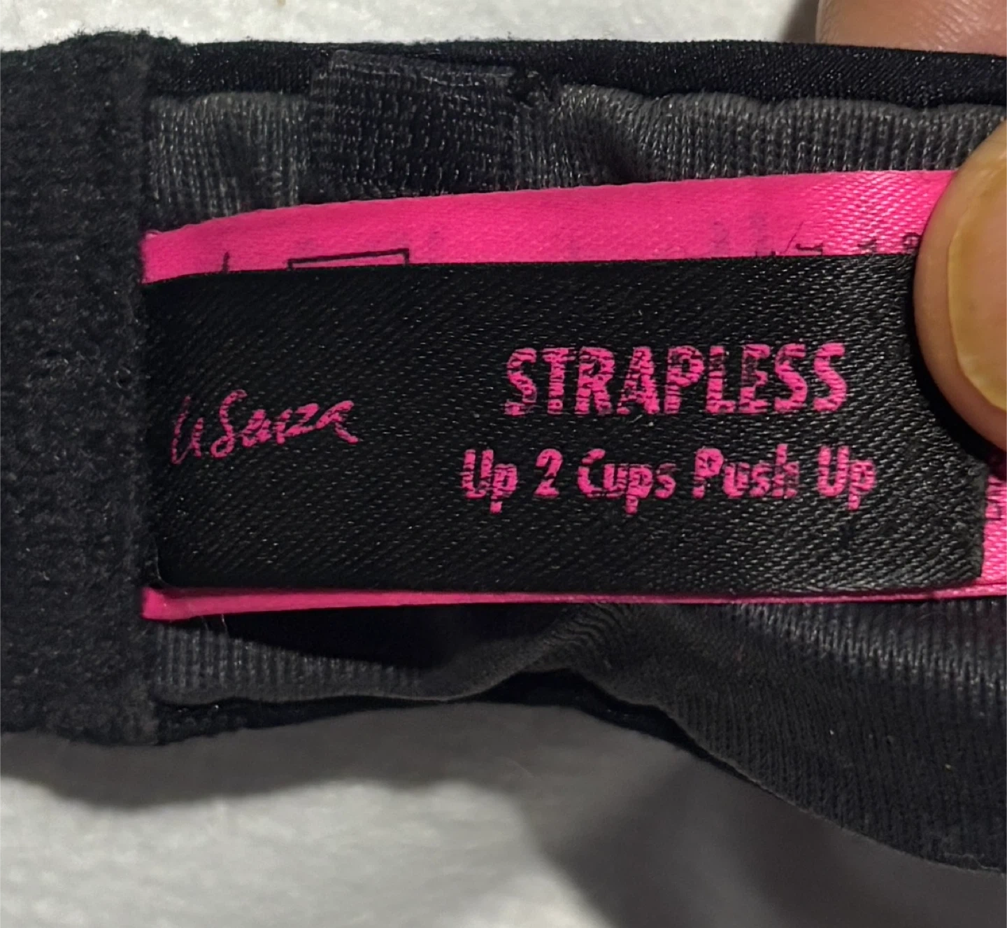 Selling a La Senza strapless bra. It's a push-up style that adds up to 2 cups. The size is 36A and it's in black!