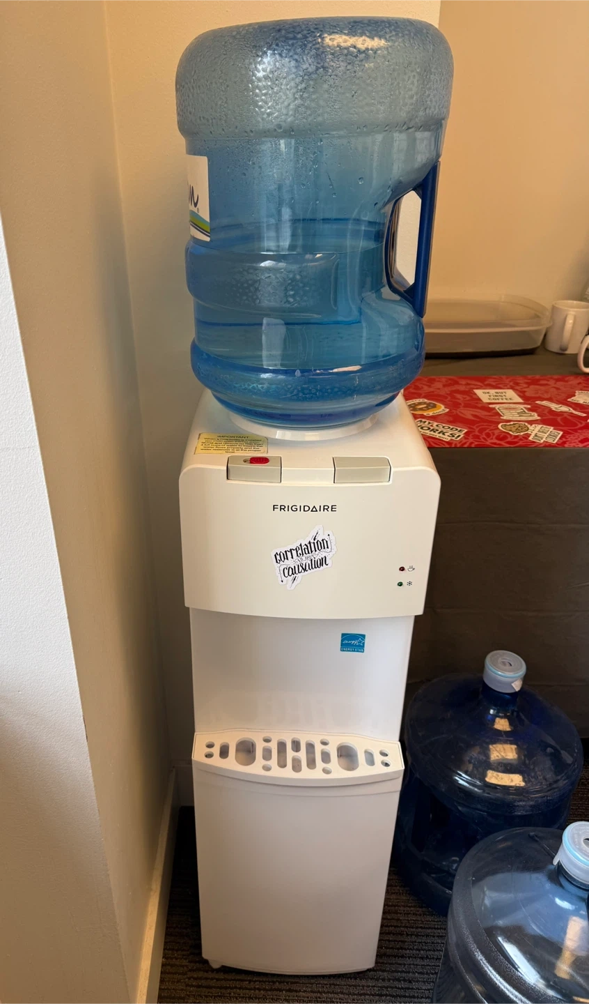 This Frigidaire water cooler dispenses hot and cold water. It's a top-loading model and features an energy-saving design. There's a handy cup rest on the front.