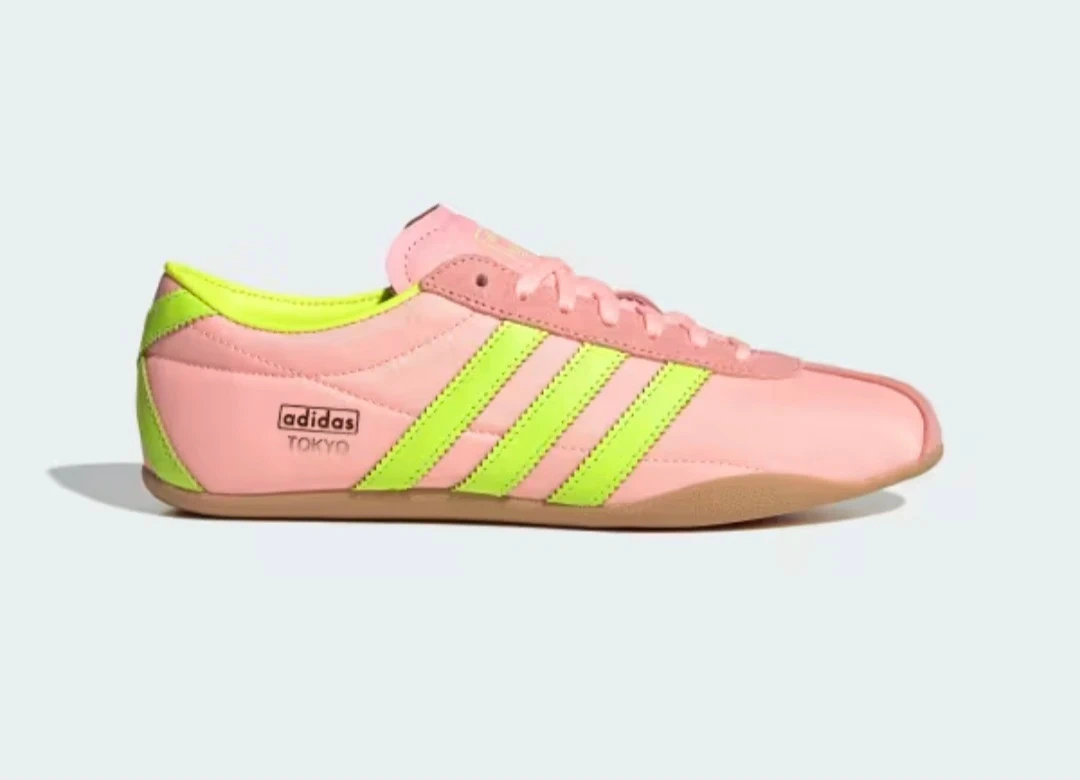 Adidas sneakers in a vibrant pink with neon yellow stripes. Features the iconic Adidas branding with Tokyo text. These shoes are stylish and eye-catching. Great for casual wear or making a statement!