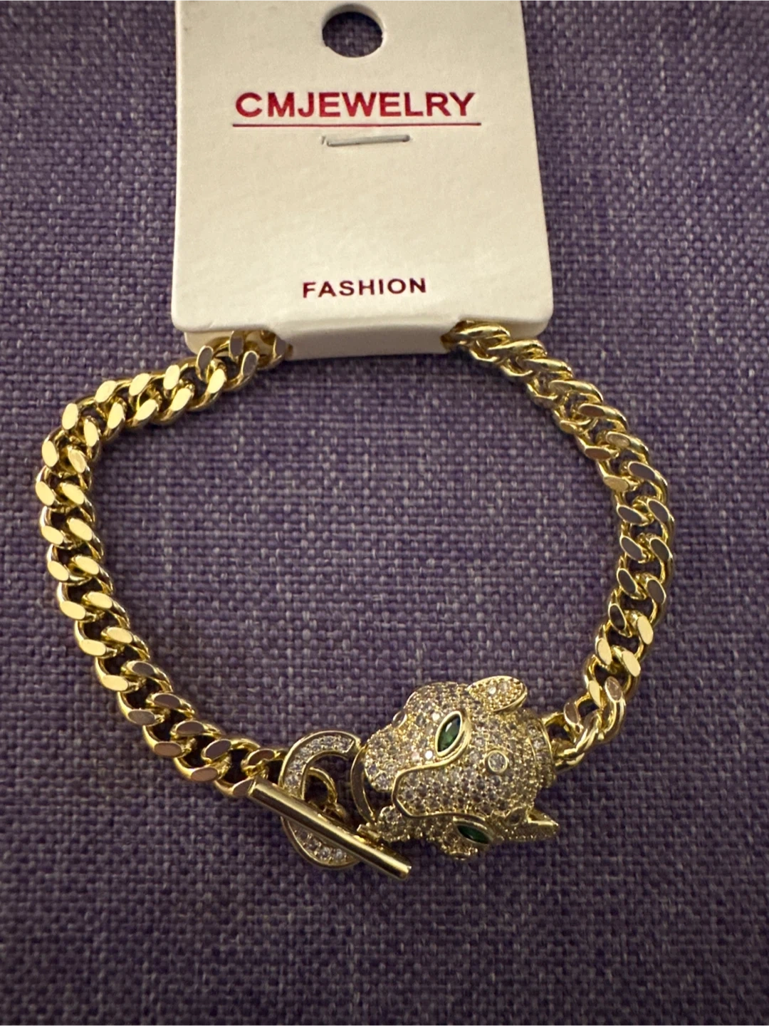 This bracelet features a chunky gold-tone chain with a detailed panther head charm. The panther is adorned with clear rhinestones and green emerald-like eyes. It has a toggle clasp closure. This piece adds a bold statement to any outfit!