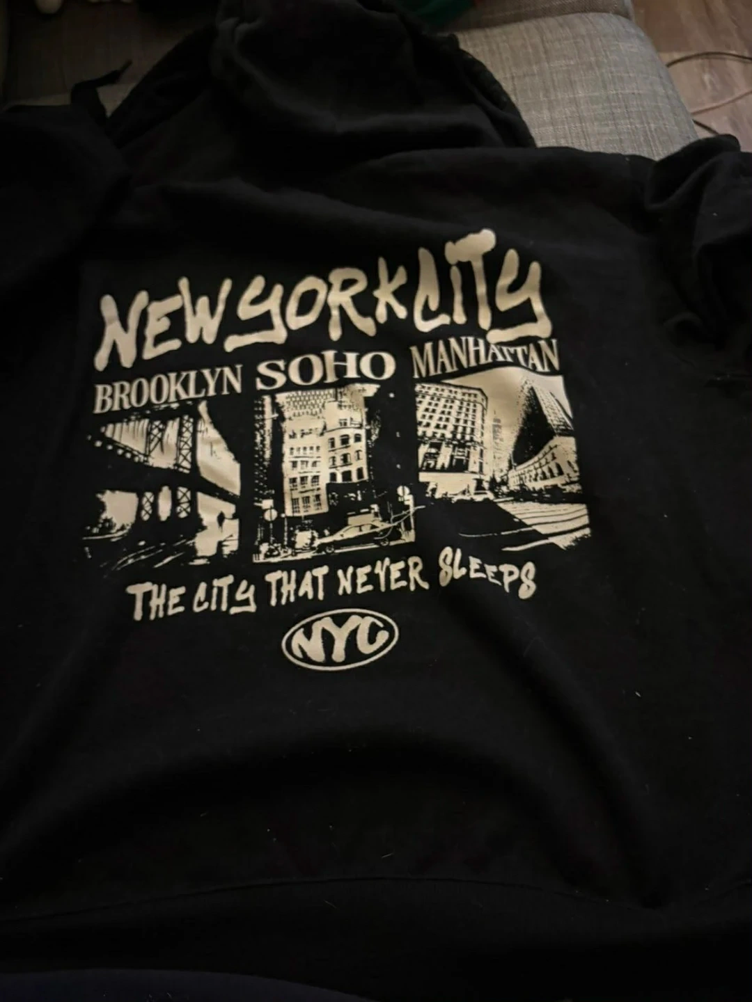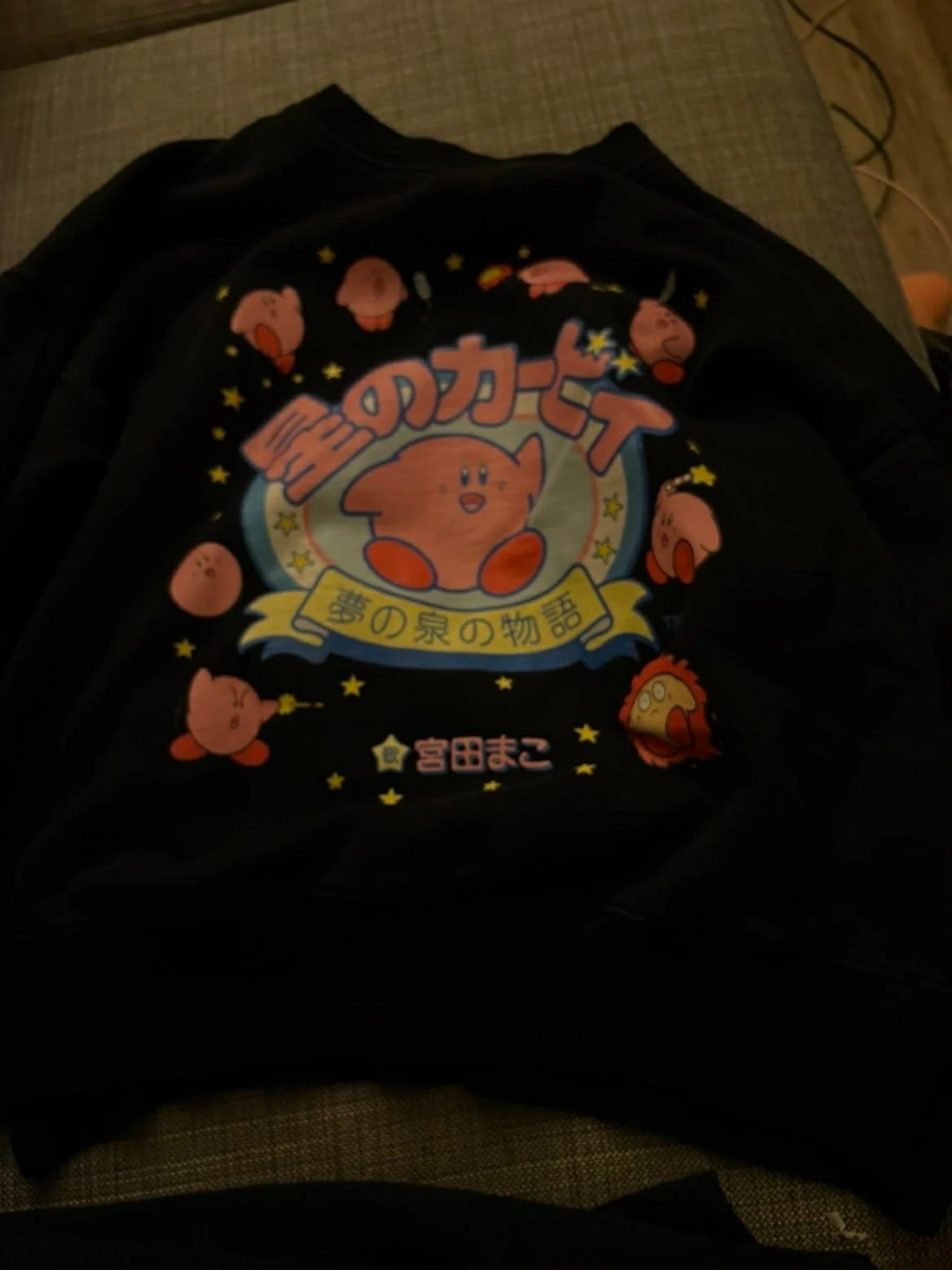 This black hoodie features a vibrant graphic of Kirby with Japanese text. It's made of a soft, comfortable material. Perfect for any Kirby fan!