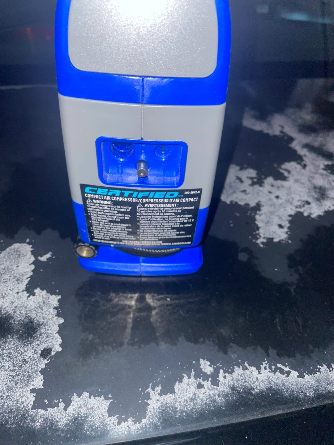 Selling a Certified compact air compressor. It's blue and grey in color and comes with all the original components. Great for inflating tires or other inflatables on the go!