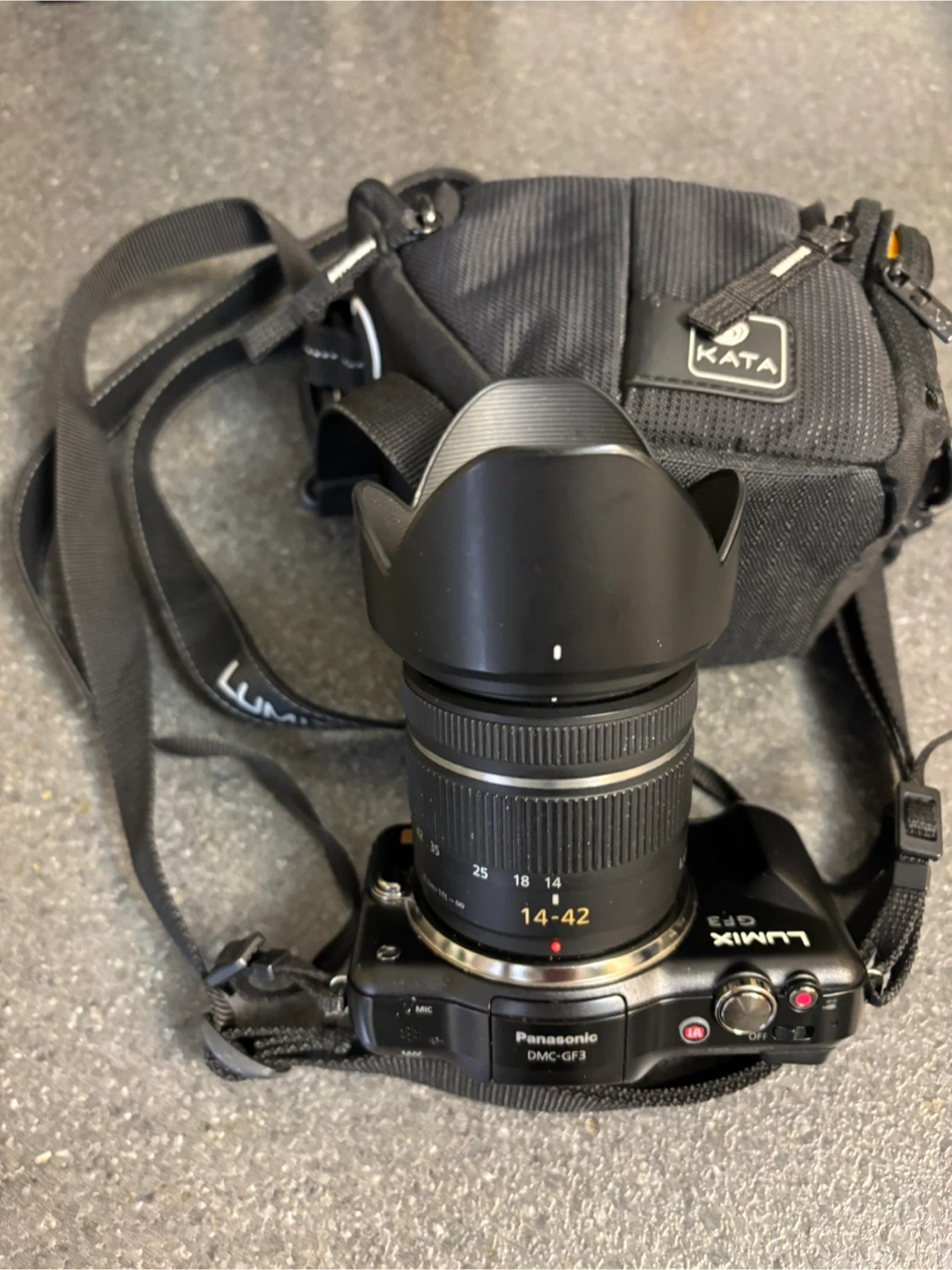 This is a Panasonic Lumix DMC-GF3 digital camera. It comes with a Lumix G Vario 14-42mm lens and a black Kata camera bag. Perfect for capturing everyday moments!