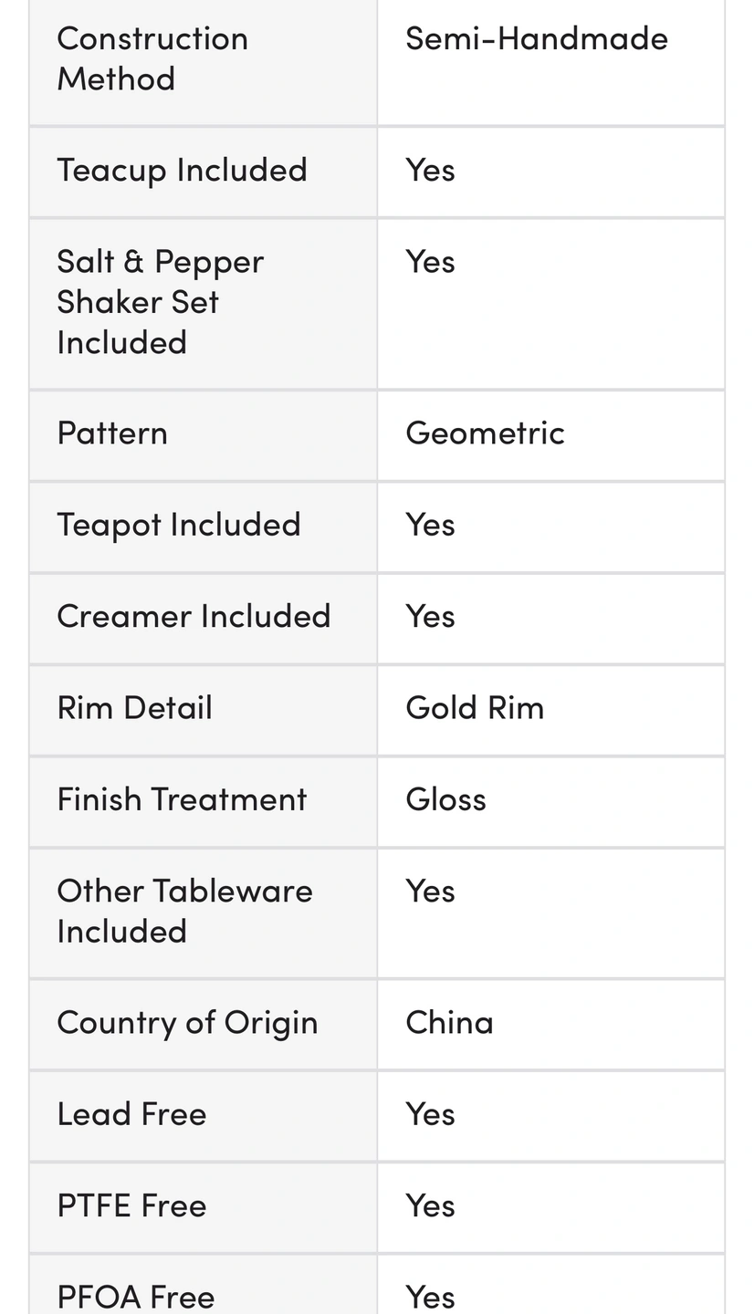 A lovely set of porcelain teacups and saucers with gold trim, a teapot, a creamer, and a sugar bowl. This set is great for entertaining guests or enjoying a cup of tea at home. The cups have a slight variation in the gold detail.