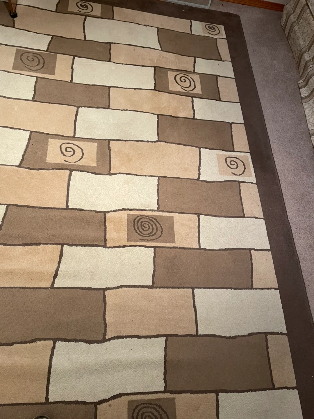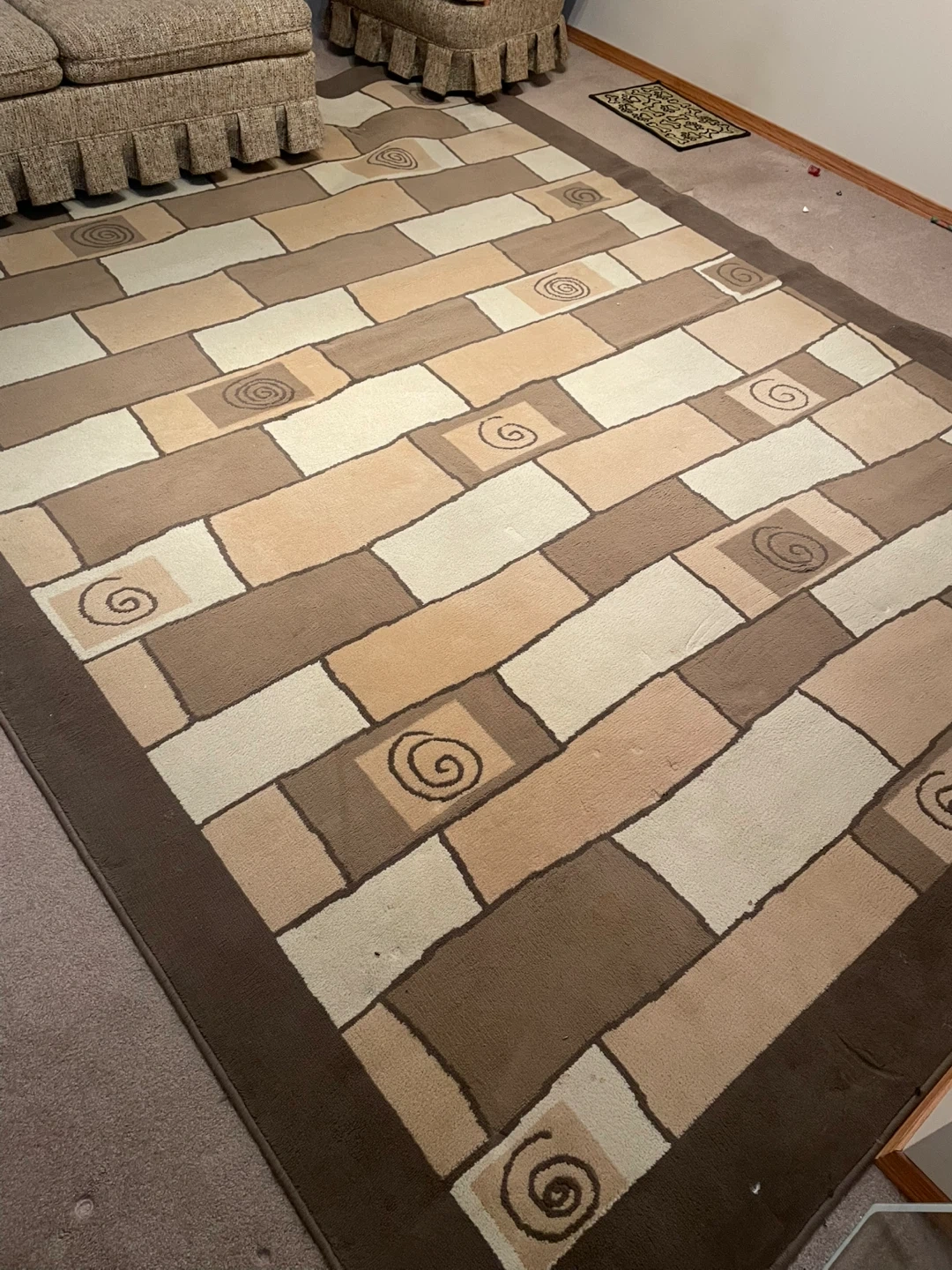 This area rug features a stylish block pattern with brown, beige, and cream colours. The design incorporates subtle swirl accents. It's a lovely addition to any living room or bedroom!