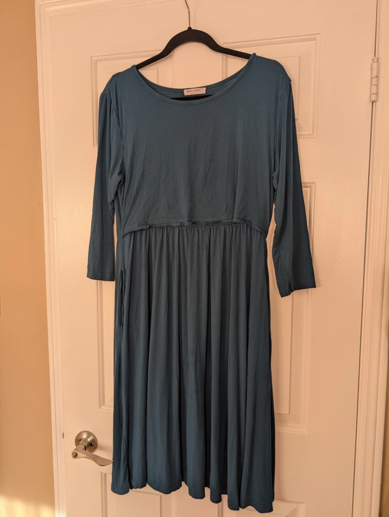 A lovely teal dress for breastfeeding, size large. It's in great shape and ready for a new home! The material is soft and comfortable, perfect for everyday wear.