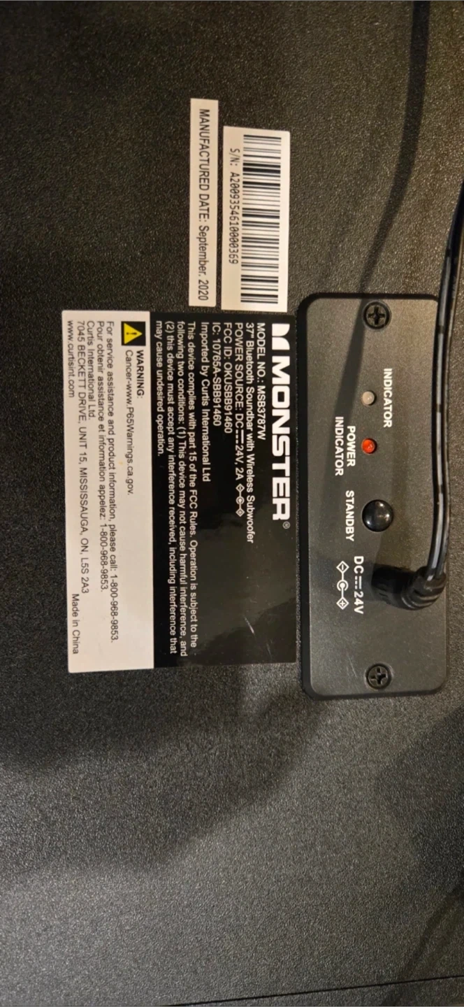 Selling a Monster MSB2071W 37" Bluetooth Soundbar with Wireless Subwoofer. Includes both the soundbar and wireless subwoofer. Manufactured September 2020