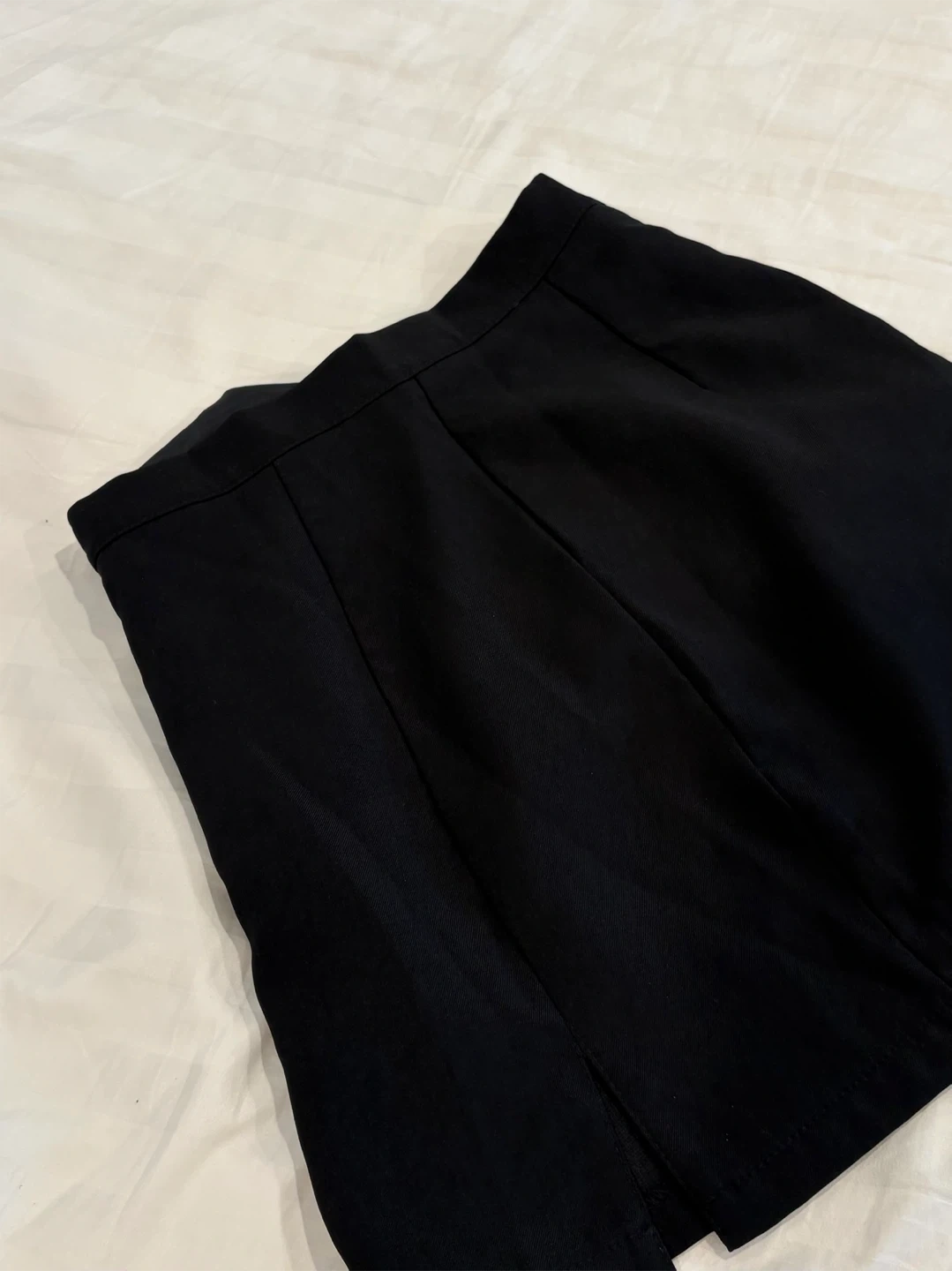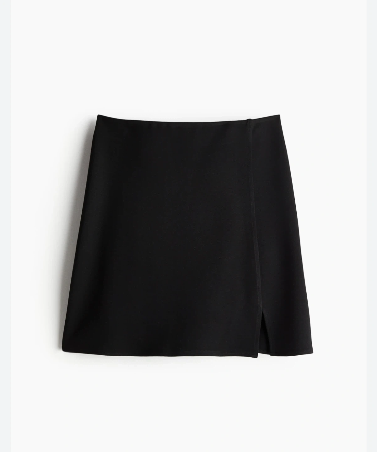 This is a black mini skirt with a stylish side slit. It's made of a smooth fabric that drapes well. The skirt is a size medium and perfect for dressing up or down.