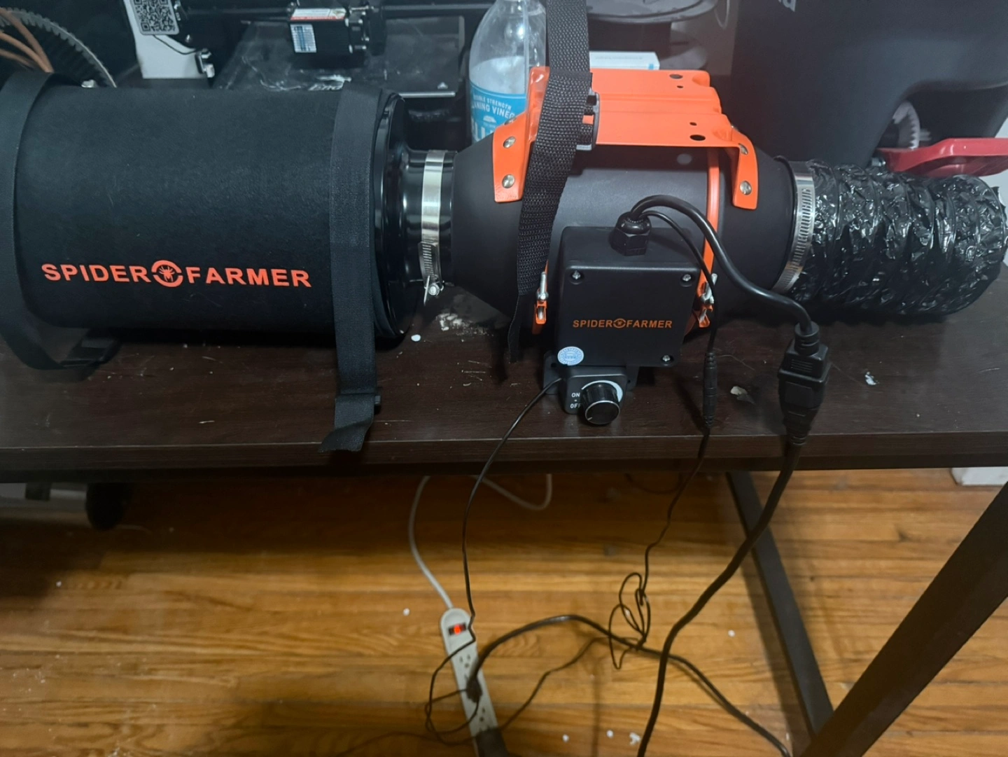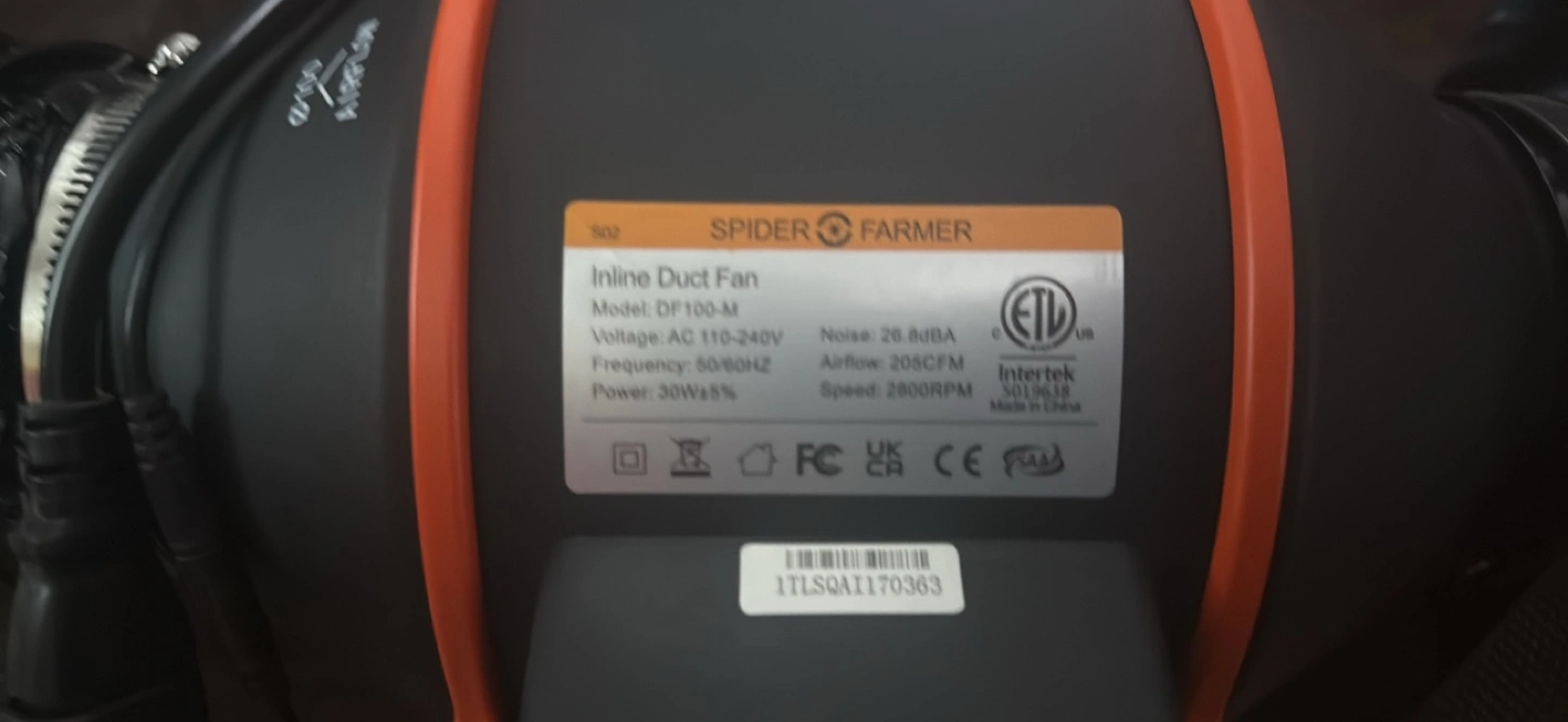 Spider Farmer inline duct fan with carbon filter and dust guard. Model DF150-M. Includes speed controller. Excellent for ventilation.