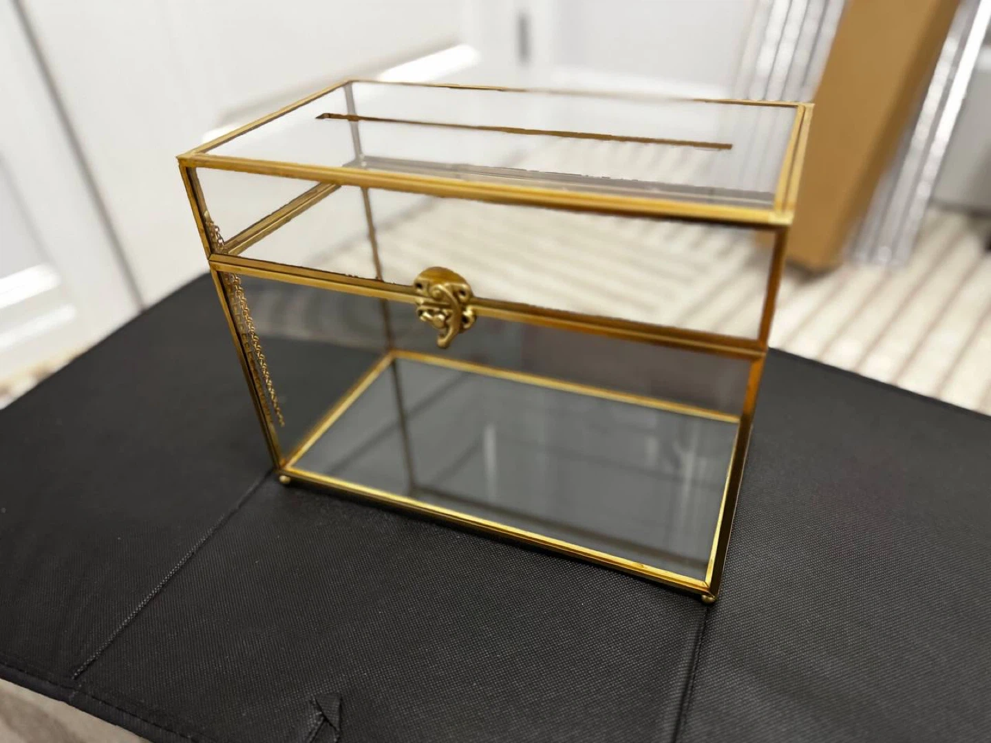 Elegant glass card box with gold metal frame and lock — perfect for weddings, receptions, graduations, and special events.