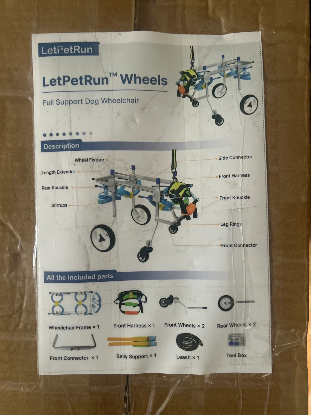 Selling a LetPetRun full support dog wheelchair. It comes with all included parts as shown on the box: wheelchair frame, front harness, front wheels, rear wheels, front connector, belly support, leash, and a toolbox