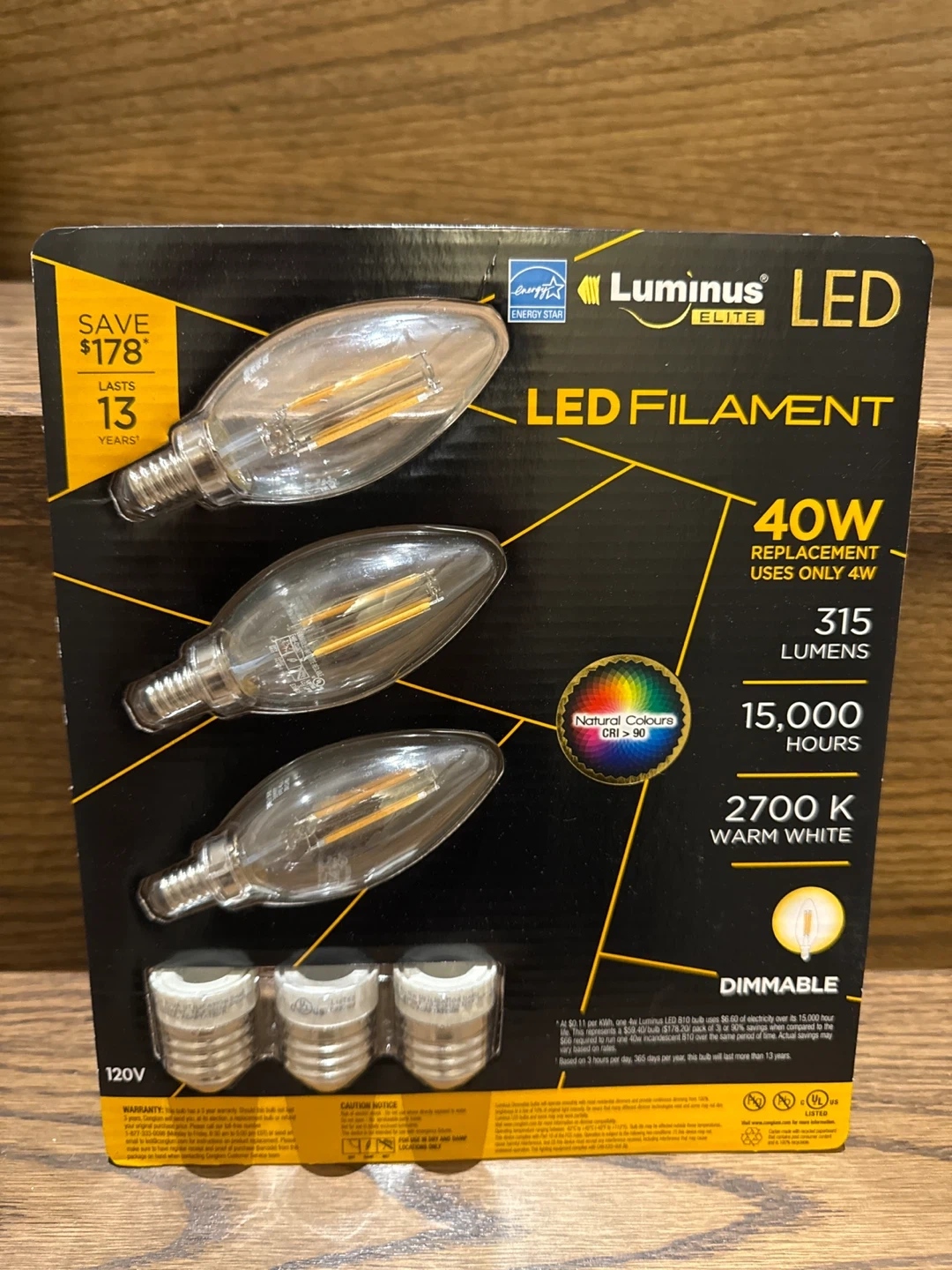 Selling a pack of three Luminus LED filament bulbs. These are 40W replacement bulbs that only use 4W, saving you energy! They produce 315 lumens of warm white (2700K) light and are dimmable. These bulbs are designed to last for 15,000 hours, which is about 13 years based on 3 hours of use per day