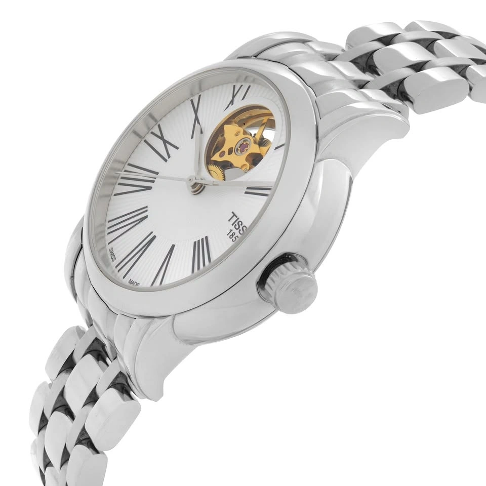 Discover the elegance of the unworn Tissot Lady Heart Steel Silver Dial Automatic Ladies Watch T050.207.11.033.00. This stunning timepiece boasts a stainless steel case and bracelet, complemented by a silver dial adorned with silver-tone hands and Roman numeral hour markers. The captivating skeleton window at the 12 o'clock position adds a touch of sophistication. Embrace luxury and style with this exquisite watch.